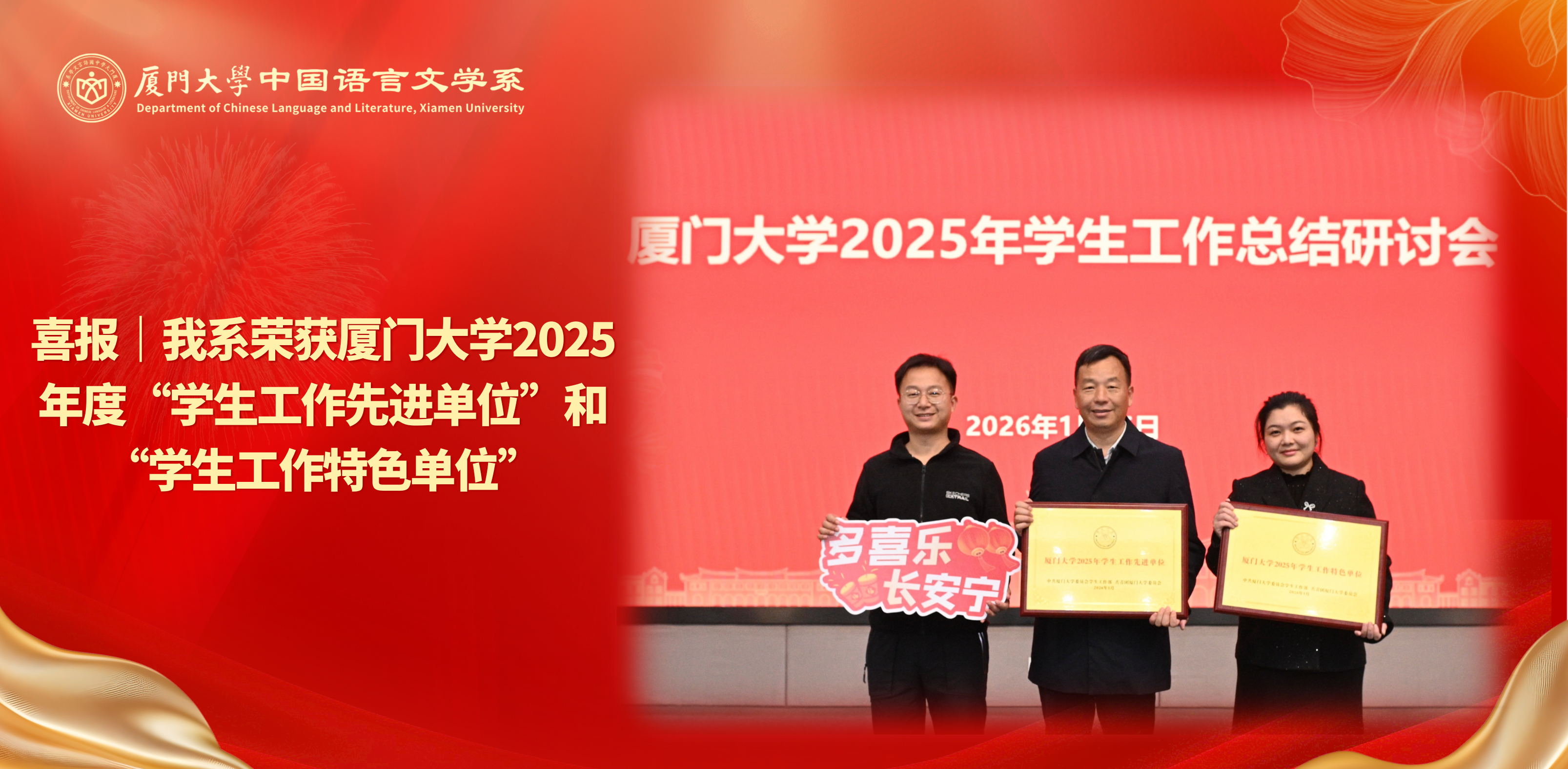 2026-011月16日,厦门大学2025年学生工作总结研讨会在翔安德旺图书馆二号报告厅举行。校党委副书记孙理、机关部处领导以及全校学工干部等参加了会议。大会总结学校2025年学生工作的成绩和经验,并对年度学生工作先进单位、特色单位和优秀辅导员等进行表彰。中文系获得“学生工作先进单位”“学生工作特色单位(港澳台学生工作)”两项荣誉。2025年,中文系学生工作在系党政领导的正确指导和全体师生的共同努力下,学生工作考评基础工作指标全部达标,...