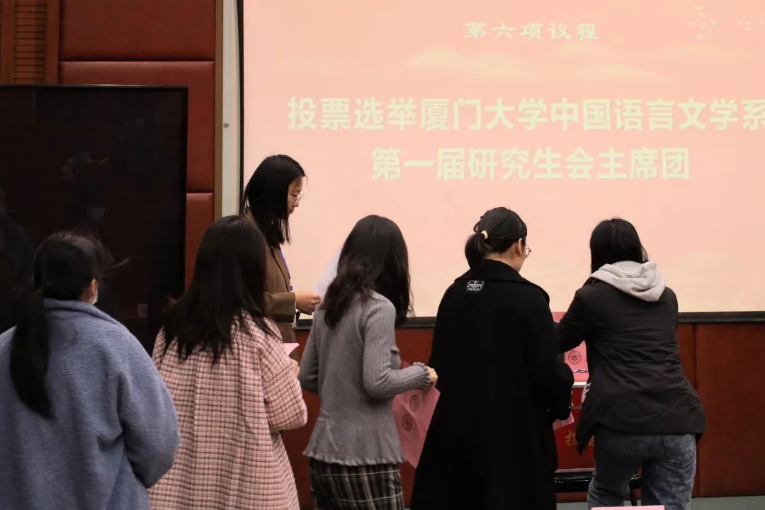大会第六项议程,代表们以高度的责任感和使命感投下手中的选票,经过严格的监票和记票,选举产生厦门大学中国语言文学系第一届研究生会主席团。