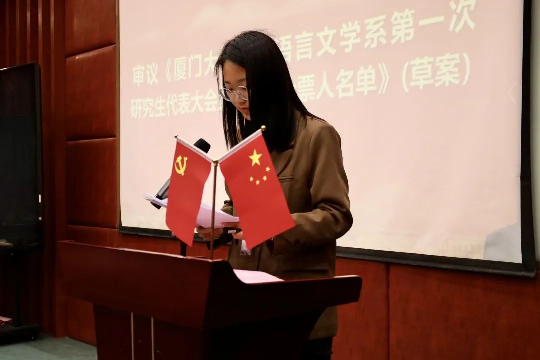 大会第三项议程,王爽宣读《厦门大学中国语言文学系第一次研究生代表大会监票人、计票人名单》,代表审议并表决,表决结果为一致通过。