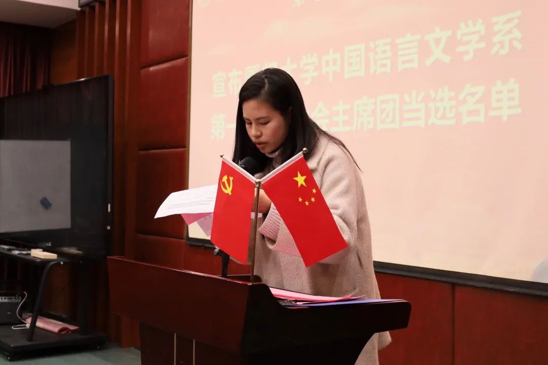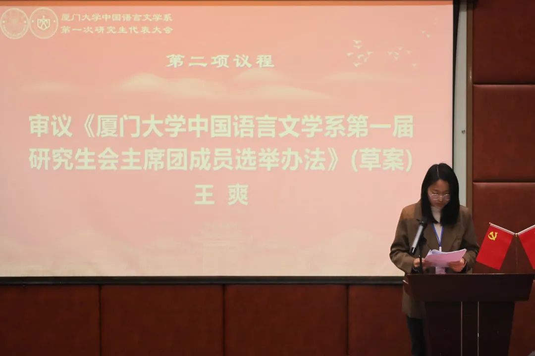 大会第二项议程,总监票人王爽宣读《厦门大学中国语言文学系第一届研究生会主席团成员选举办法》,代表审议并表决,表决结果为一致通过。