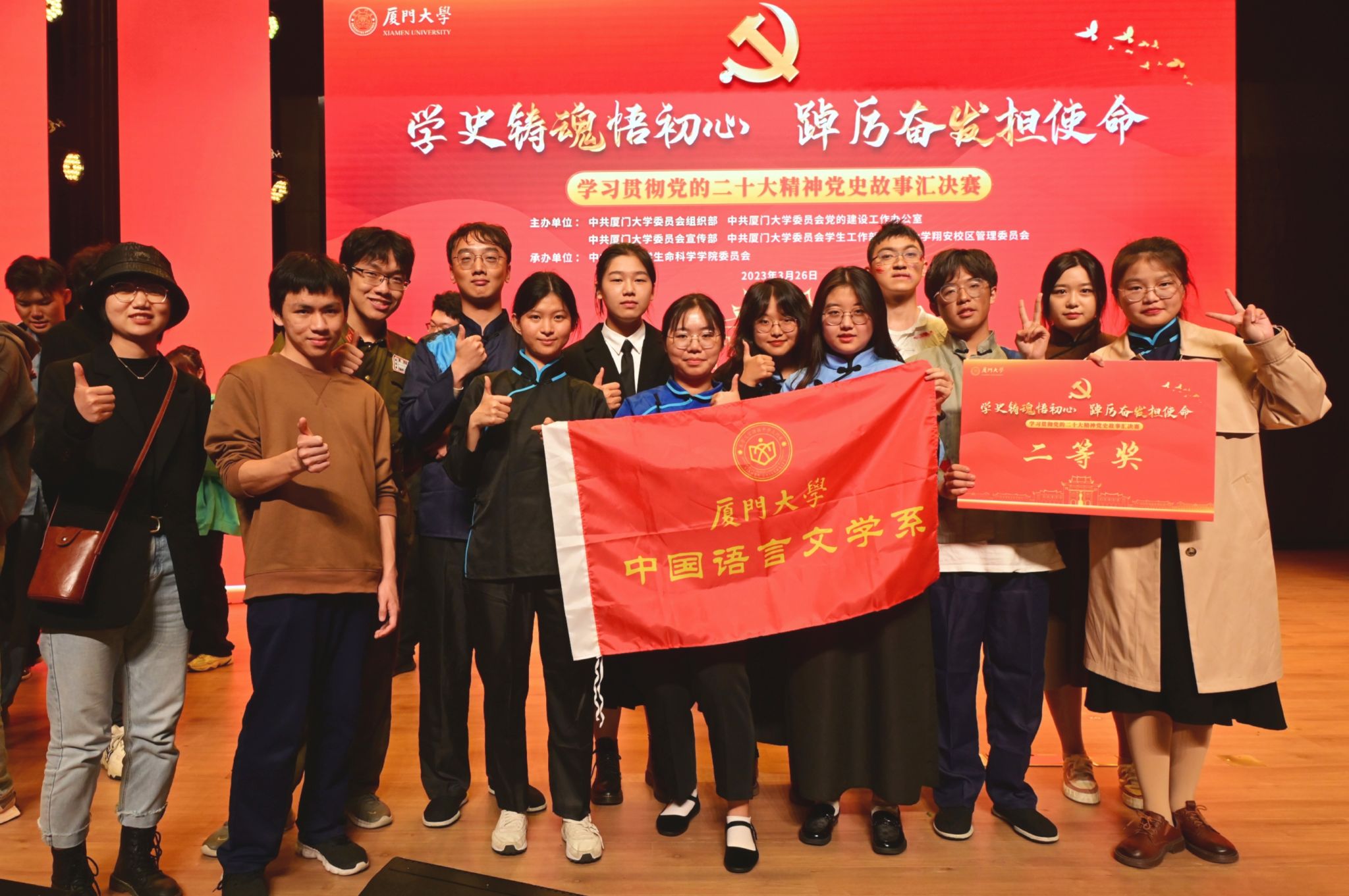 2023年3月26日下午,“学史铸魂悟初心,踔厉奋发担使命”学习贯彻党的二十大精神党史故事汇决赛在厦门大学翔安校区举行。校关工委常务副主任赖虹凯,厦门市委宣传部理论处处长王彦龙,校党委组织部/党建办、宣传部、学生工作部、翔安校区管委会等单位的负责同志,各学院(系)党委副书记、辅导员和学生们汇聚一堂、共飨盛宴。由中国语言文学系、历史与文化遗产学院和哲学系组成的文史哲联队携作品《忆二七精神,感英烈之魂——纪念京汉铁路工人大罢工一百周年》参赛并荣获二等奖。我系吕凤楠老师担任指导老师,肖玥、连晨阳、陈欣睿、尤彬茹四位同学担任演员并负责剧本撰写、剧组统筹等工作。