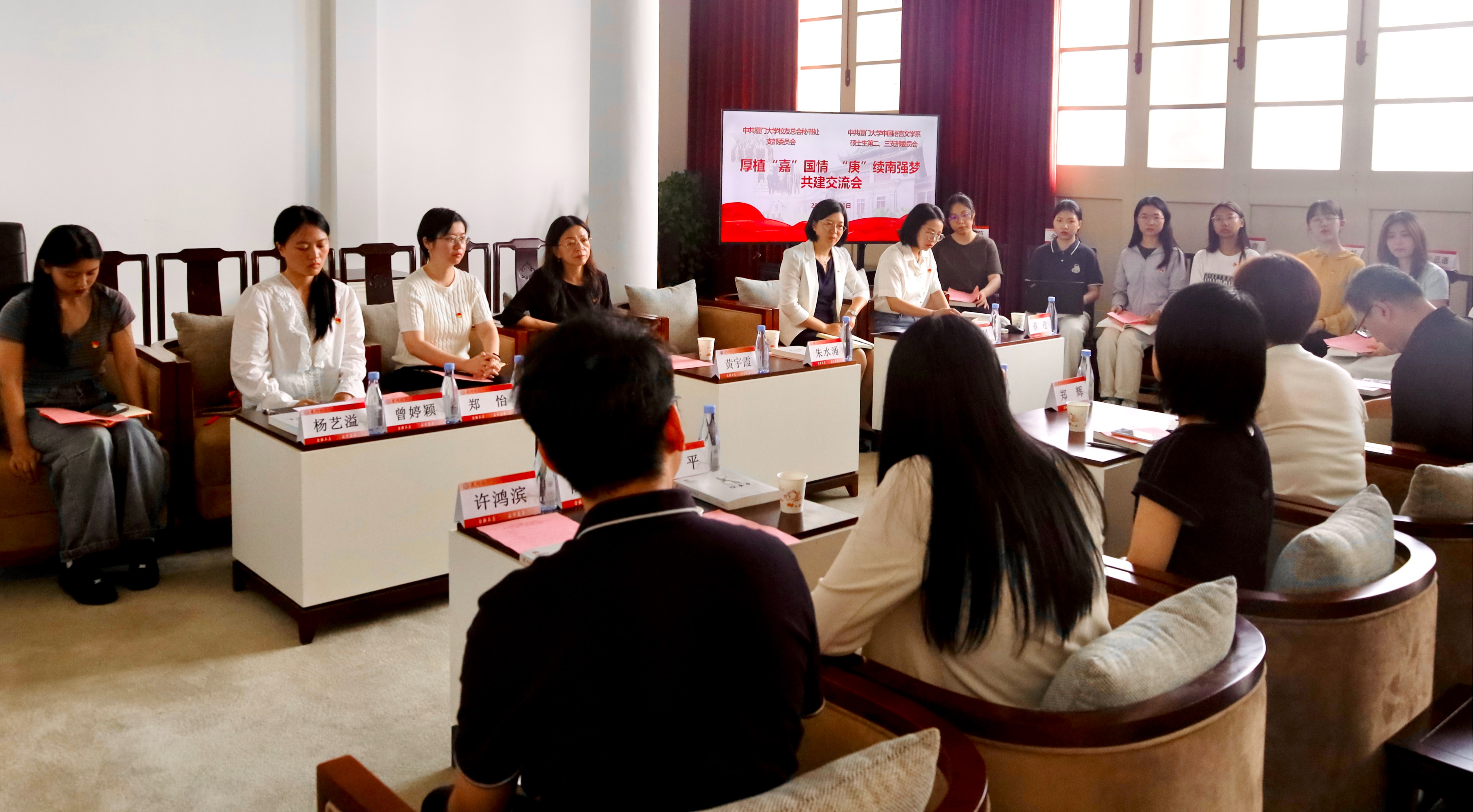 5月10日下午,厦门大学校友总会秘书处党支部与中国语言文学系硕士生第二、三党支部以“厚植‘嘉’国情,‘庚’续南强梦”为主题开展联学共建交流会。厦门大学校友总会秘书处秘书长王智兰、副秘书长郑辉等8位校友总会秘书处党支部成员,中国语言文学系党委书记黄宇霞、副书记葛学凤及中国语言文学系硕士生第二、三党支部成员代表参加交流会,会议由葛学凤主持。