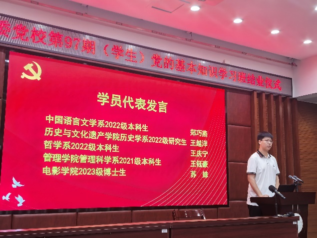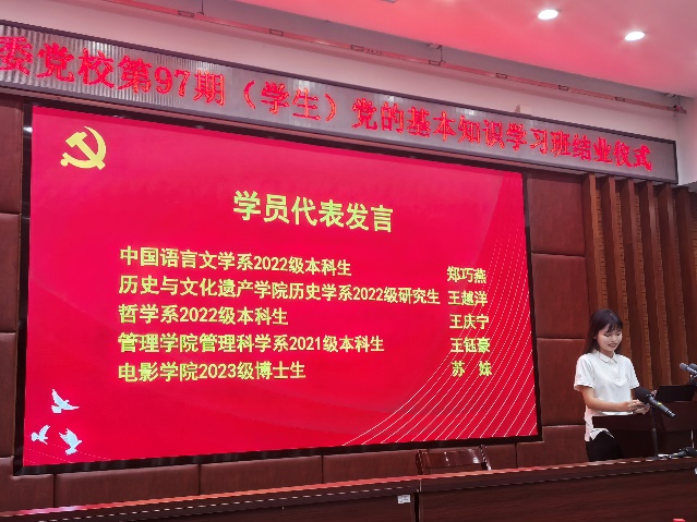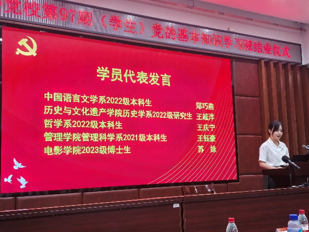 出席结业仪式的有管理学院党委书记张明智、党委副书记郑碧娇,历史与文化遗产学院党委副书记张晗,中国语言文学系党委副书记葛学凤,电影学院党委副书记张晴,各学院老师,以及本期学习班全体学员。