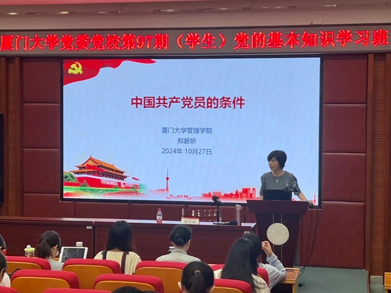 10月27日上午,管理学院党委副书记郑碧娇围绕“中国共产党党员的条件”这一主题,深入浅出,全面细致地剖析了党员应当具备的基本素质、党员的基本条件、党员的权利与义务,讲解过程中结合生动鲜活的党员先进事例和振奋人心的革命先烈事迹帮助大家理解党员在党内生活中的角色定位和责任担当,激发了学员们的爱国热情和为党的事业奋斗的决心。