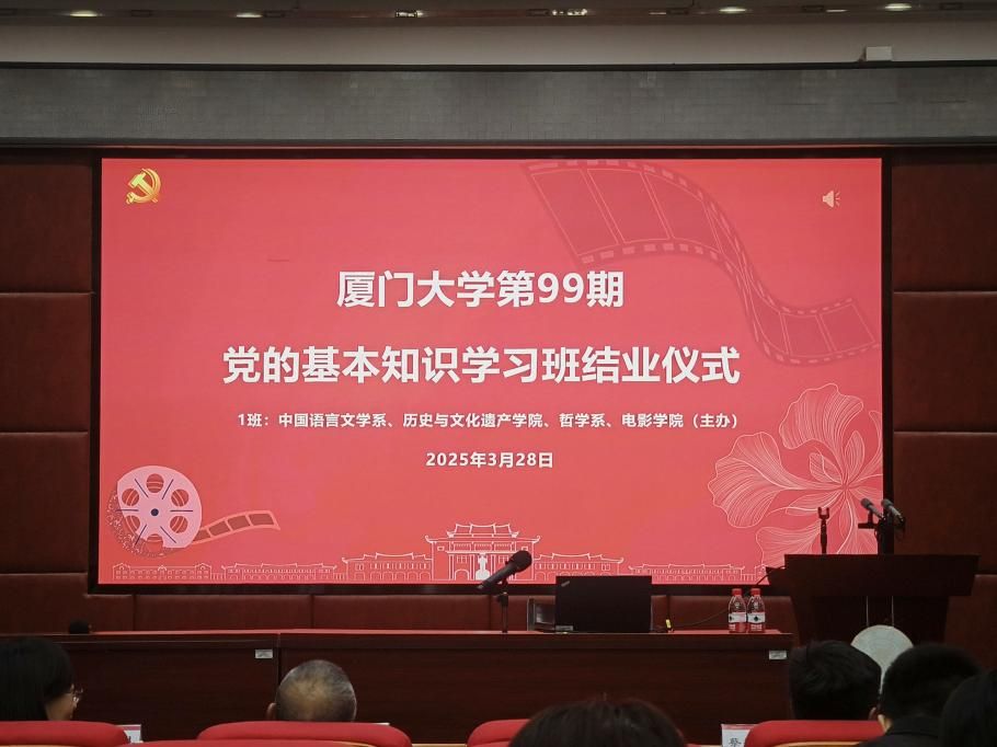 3月28日下午,厦门大学第99期党的基本知识学习班结业仪式在南光一101举行,电影学院党委书记林公明、中国语言文学系党委副书记葛学凤、历史与文化遗产学院党委副书记张晗、中国语言文学系团委书记吕凤楠、哲学系团委书记蔡振磊、历史与文化遗产学院辅导员左霆华、电影学院党务秘书潘晨茁以及本期学习班全体学员出席结业仪式。会议由电影学院团委书记吴维主持。