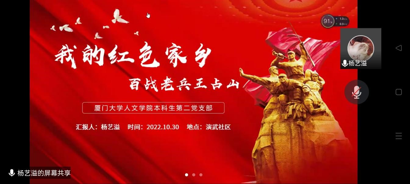 10月30日,人文学院本科生第二党支部携演武社区,于线上开展了“我的红色家乡”第二期活动,支部党员周颖、杨艺溢、袁婉彦带领演武社区的孩子们一起学习了“七一勋章”获得者——百战老兵王占山的故事,杨艺溢同志担任主讲人。