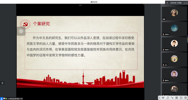 为深入学习贯彻习近平总书记在十三届全国人大五次会议内蒙古代表团审议时发表的重要讲话,抓住铸牢中华民族共同体意识这条主线,3月26日,中文系硕士生第一党支部在线上开展了以“中华一家亲,共筑中国梦”为主题的“固定党日+”活动。本次学习立足于中华民族多元一体的伟大格局,聚焦于铸牢中华民族共同体意识的应有之义和必由之路,并结合中文系专业视角,深切体会各民族团结一心奋斗中国梦的重要内涵。