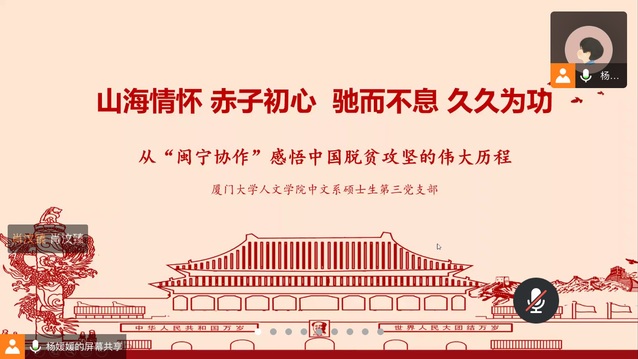 2021年1月31日晚上,人文学院中文系硕士生第三党支部线上学习闽宁对口扶贫协作援宁群体先进事迹。会议由支部书记杨媛媛主持,支部全体党员与会。