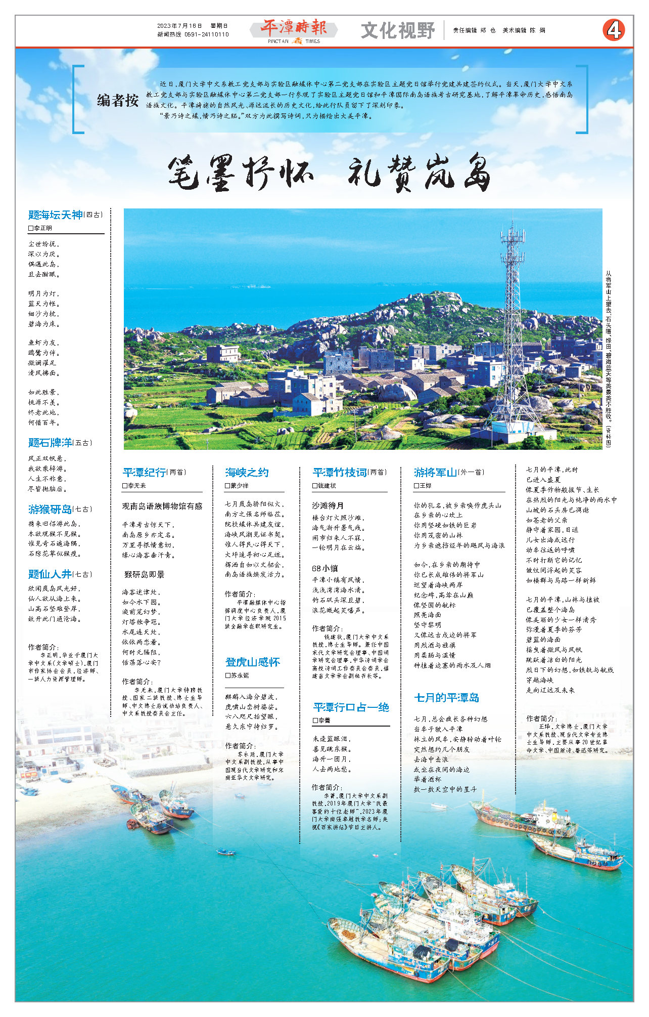 2023年7月16日,《平潭时报》第3828期第四版刊登我系李无未教授、苏永延副教授、钱建状教授、李菁副教授、王烨教授,系友李正明和厦门大学校友蒙少祥等师生多篇诗词作品。