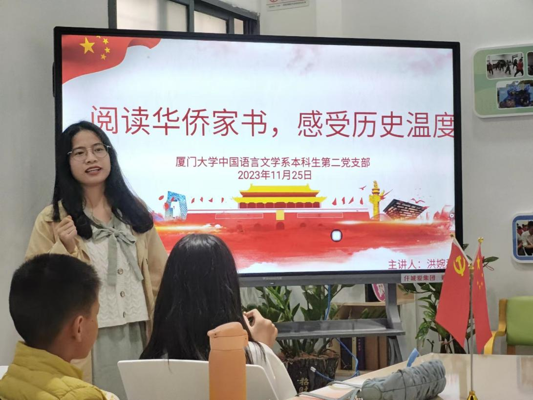 11月25日,中国语言文学系本科生第二党支部携演武社区,于演武社区活动中心开展了“红色家书”第八期活动,支部党员洪婉秋、冯晓琴、林初晴带领演武社区的孩子们一起学习了爱国华侨黄添培的故事。洪婉秋同志担任主讲人。