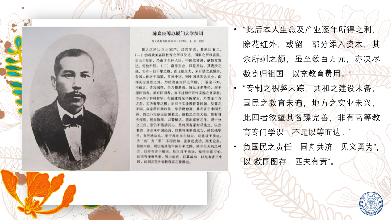 郭建:陈嘉庚先生一生为辛亥革命、民族教育、抗日战争、解放战争、新中国建设作出了卓越的贡献。他胸怀“教育乃立国之本,兴学乃国民天职”的信念在1921年创办了厦门大学,克服重重困难,以极大的勇气和毅力,抱定“一息尚存,此志不减”的精神和“宁可变卖大厦,也要支持厦大”的决心,独资支撑厦大16年,并在此后将厦门大学无条件奉献给国家。校主先生大公无私的高尚品德,先天下之忧而忧的博大胸怀,锲而不舍的拼搏精神都是留给世人的宝贵财富。作为青年学生,我们应该充分学习“嘉庚故事”,践行“嘉庚精神”,争做“嘉庚传人”,争取个人进步,助力母校发展,促进社会进步。