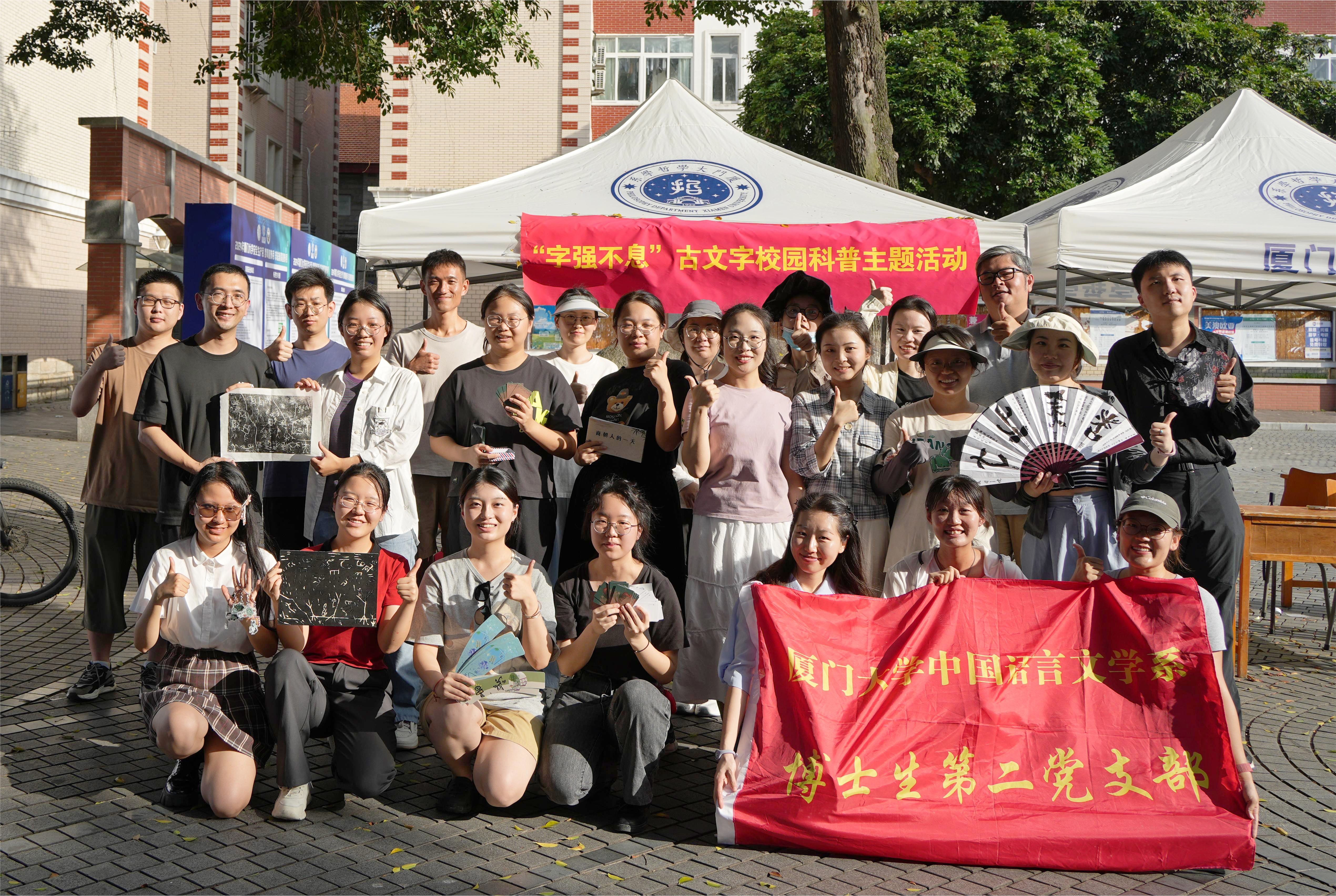 习近平总书记在考察殷墟博物馆时指出:“中国的汉文字非常了不起,中华民族的形成和发展离不开汉文字的维系”。为宣扬中华优秀传统文化,让同学们深入了解古文字的魅力,中国语言文学系博士生第二党支部于6月20日在厦门大学三家村广场举办“字强不息”古文字校园科普主题活动。本次活动是支部立项的重要内容之一,以中文系张惟捷教授开设的《甲骨文金文与商周文化》课程为依托,由张惟捷教授指导,支部全体成员及中文系部分研究生、本科生共同参与。