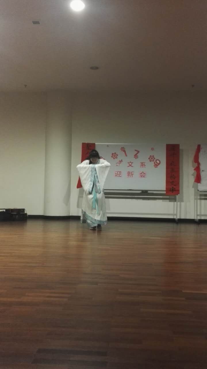 “子曰礼尚往来,吾老人幼皆亲爱……”迎新会上,伴随着悠扬的乐曲《礼仪之邦》,中文系叶佩宜同学带来汉服古典舞,展现千年古国的君子之风,唯美典雅的舞姿将晚会推向第一个高潮。