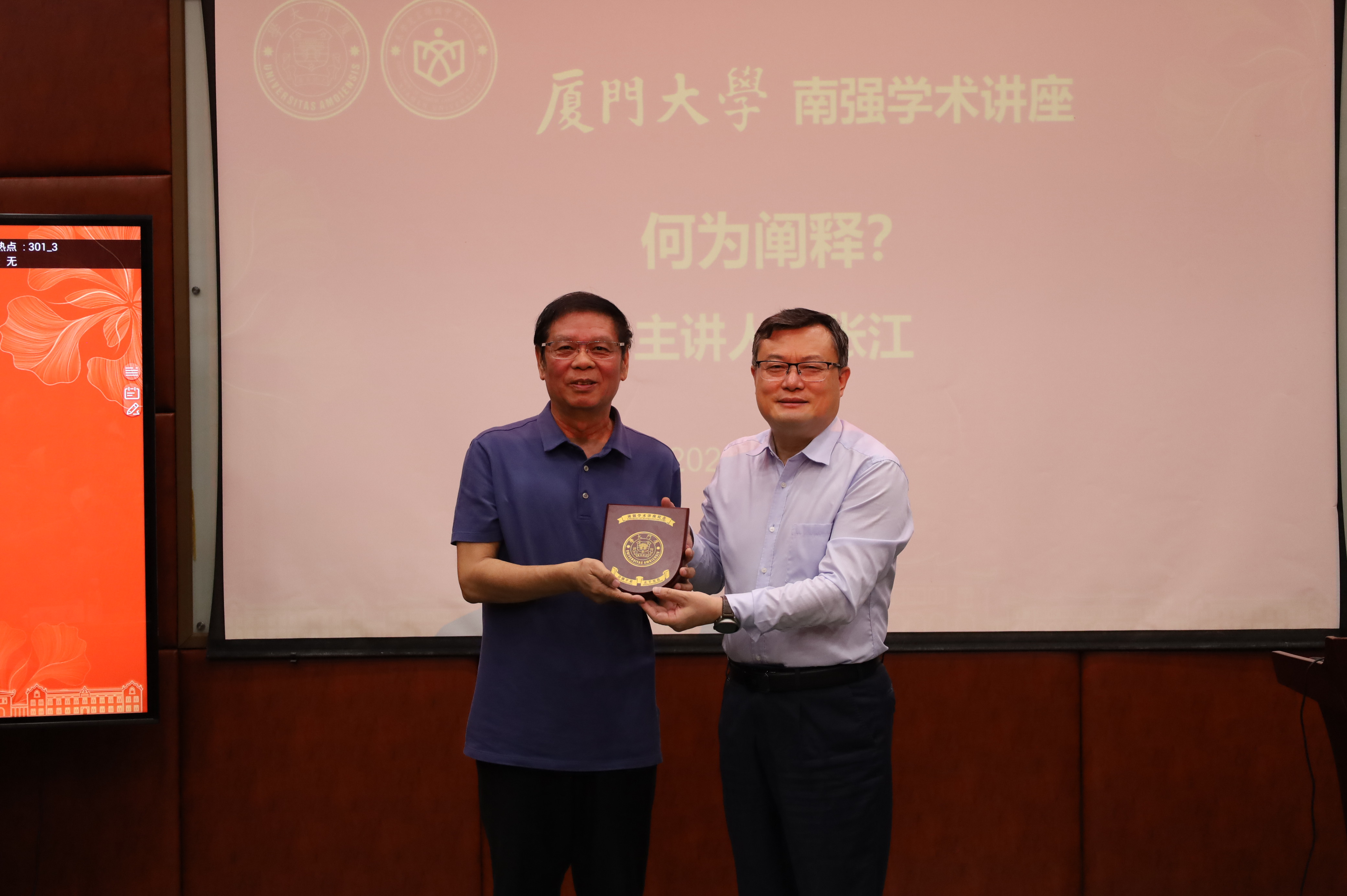 讲座开始前,张荣为张江颁发“南强学术讲座”纪念牌。