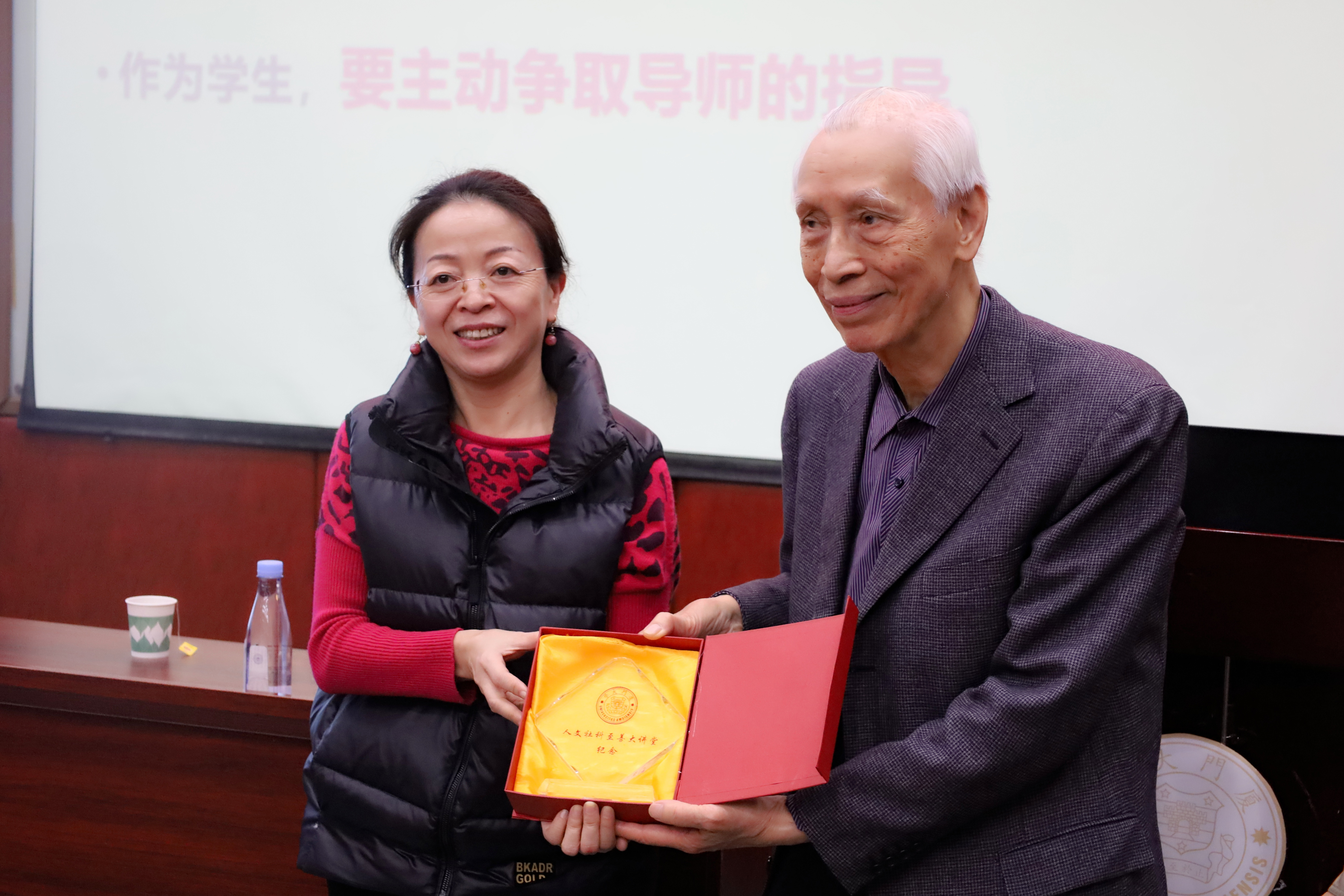 黄宇霞为陆俭明颁发“厦门大学人文社科至善大讲堂”纪念牌。