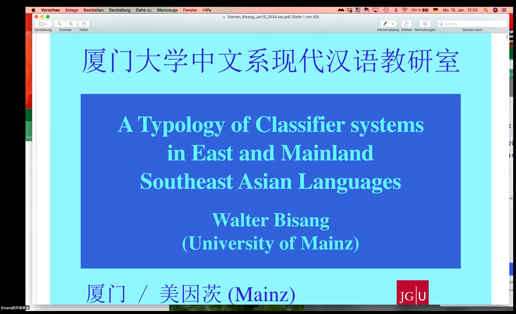2024年1月15日晚,世界著名语言学家、德国美因茨大学语言学系教授、欧洲科学院院士Walter Bisang应厦门大学中文系现代汉语教研室之邀做了题为“A Typology of Classifier Systems in East and Mainland Southeast Asian Languages”的线上学术讲座。本场讲座由厦门大学中文系许彬彬助理教授主持。本校及各高校的学子积极参与,于“云端”相聚共交流。