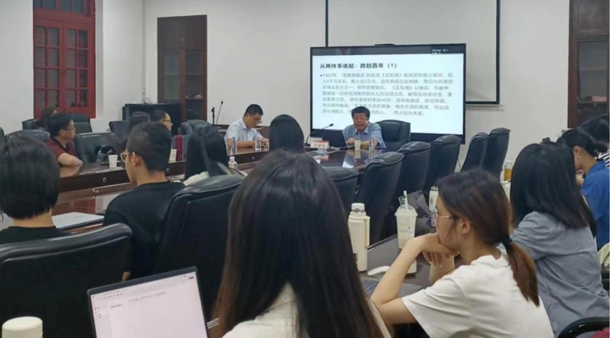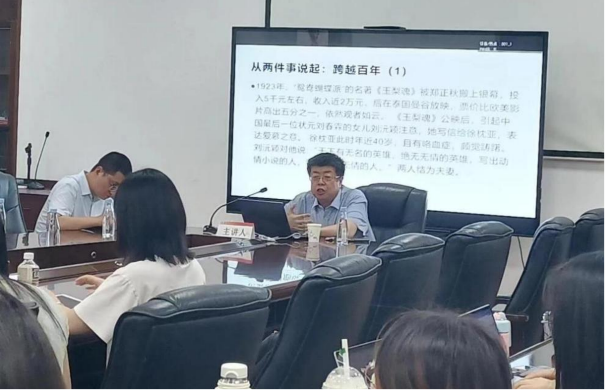 随后,讲座正式开始。张教授以《玉梨魂》、《流浪地球》两部文学作品跨越百年的呼应为始,对两部作品进行对照,指出这一百年的跨越是对“现代”问题的呼应,与面临的当下相关联。接着张教授从跨媒介与跨语境的延伸两个方面讲述改编的意义,并引出当下我们所讨论的改编的含义,回应讲座的主题。张教授也多次提到金宇澄《繁花》的改编,以其为典例,揭示改编的“死”与“活”,并从《繁花》的情节、人物等设定的根本改动表明当下改编最重要的呈现,得出影视与文学各自发展、各有交集的结论。张教授在讲述过程中不仅关注到文学与改编之间关系的变化,探讨中国影视和文学关系的多样化、复杂化,还聚焦到当下影视与文本的新形态,在广阔的视野中探索出文学与影视平行和交叉的延伸关系,令师生受益匪浅。