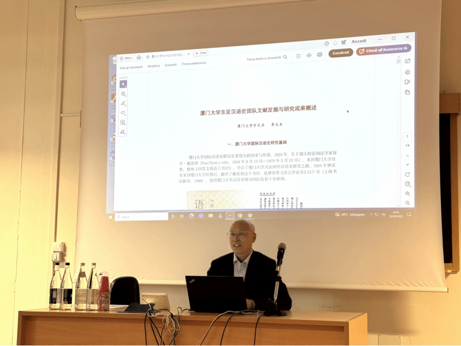 在当地,中文系师生受到了包括马西尼(Prof. Federico Masini)教授、史华罗(Prof. Paolo Santangelo)教授、研究员托雷(Dr. Gabriele Tola)在内的罗马大学东方学系众多知名学者的热情接待。关西大学名誉教授内田庆市、东西学术研究所奥村佳代子教授等国际汉学名家也共同参与了研讨。李无未在会上做主旨发言,系统介绍了厦门大学汉语史研究的学术传承和研究成果,并表示希望通过此次会议与欧洲同仁互学互鉴,共同推动东亚汉语史研究的发展。陈明娥、钟雪珂也逐一介绍了自己目前主要的研究方向,以及国家社科基金项目承担等情况。会议期间,中文系四位研究生也分别发言,展现出扎实的学术功底与创新的研究视角,获得了与会专家的积极反响。