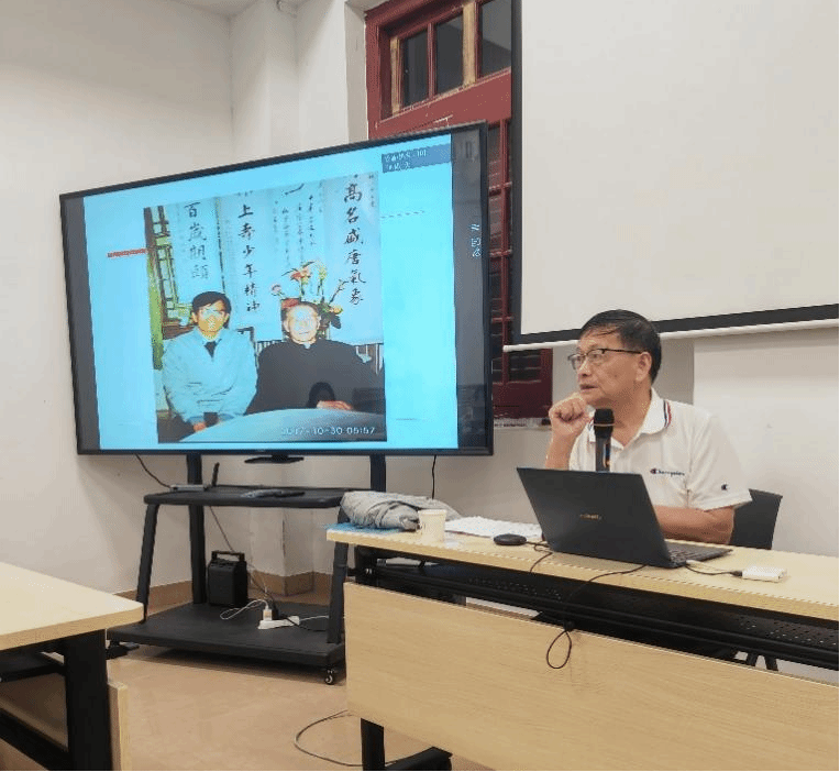 在讲座的最后,徐志啸教授以林庚先生为袁行霈教授《中国诗歌艺术研究》作的序为例,让大家深刻体会林庚先生的才学,并通过孙玉石教授仿照九言体写的《送别林庚先生》以及徐志啸教授与林庚先生的照片、贺卡、信件等,追忆林庚先生生前的形与神,他的诗歌创作、学术研究成果、授课风度、言谈举止等。