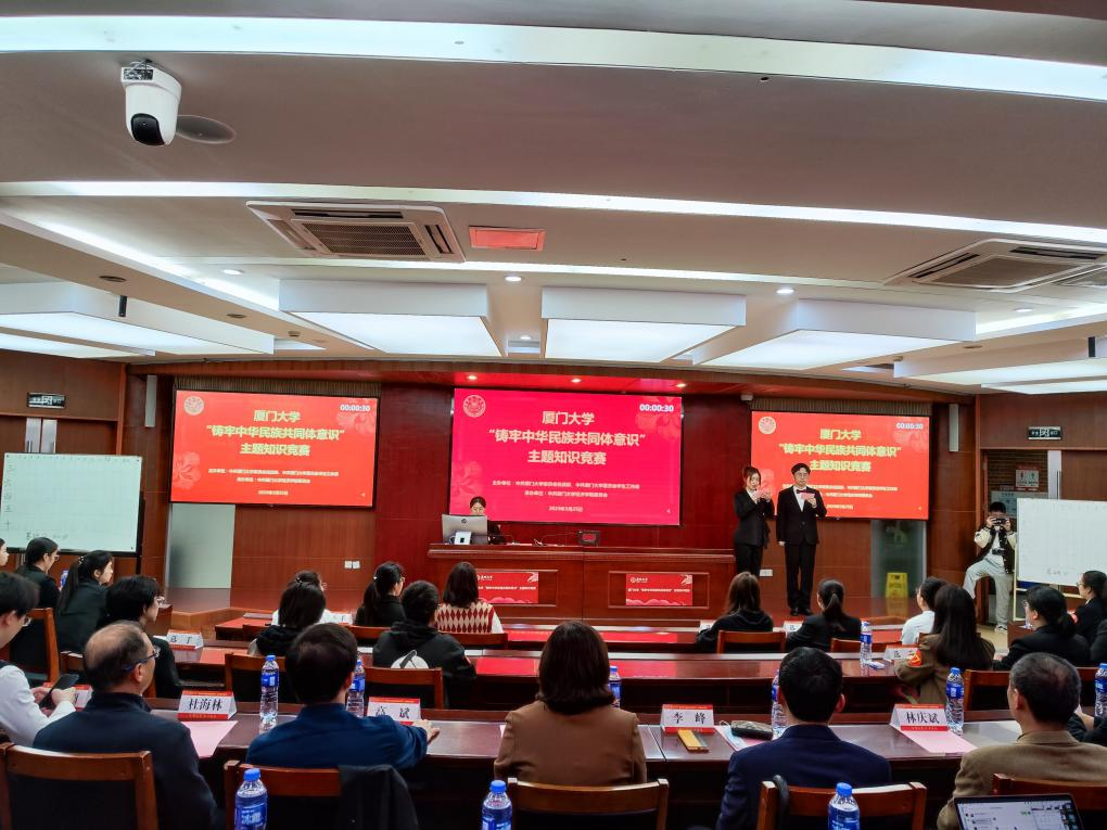 为深入学习宣传贯彻党的二十大精神,落实党的二十大报告“以铸牢中华民族共同体意识为主线,加强和改进党的民族工作”的要求,学习习近平总书记关于加强和改进民族工作的重要思想,3月25日下午,厦门大学“铸牢中华民族共同体意识”主题知识竞赛总决赛在经济楼N203举行。