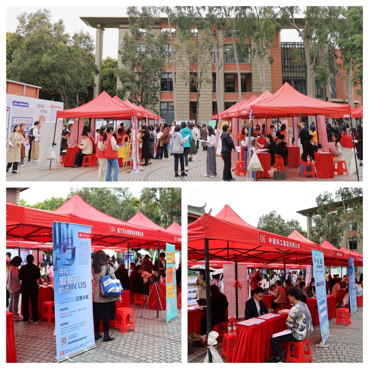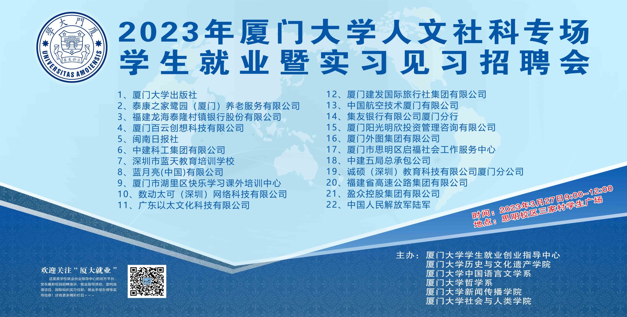 为切实做好学生就业工作,搭建毕业生与用人单位交流的平台,满足人文社科类专业学子的就业、实习需求,3月27日上午,厦门大学人文社科专场学生就业暨实习见习招聘会于思明校区三家村广场如期举行。本次招聘会由厦门大学就业创业指导中心、中国语言文学系、历史与文化遗产学院、哲学系、新闻传播学院、社会与人类学院联合主办,共有24家高质量单位参加,提供了许多就业、实习岗位,涵盖传媒、社工、旅游、教育、军事等诸多领域。