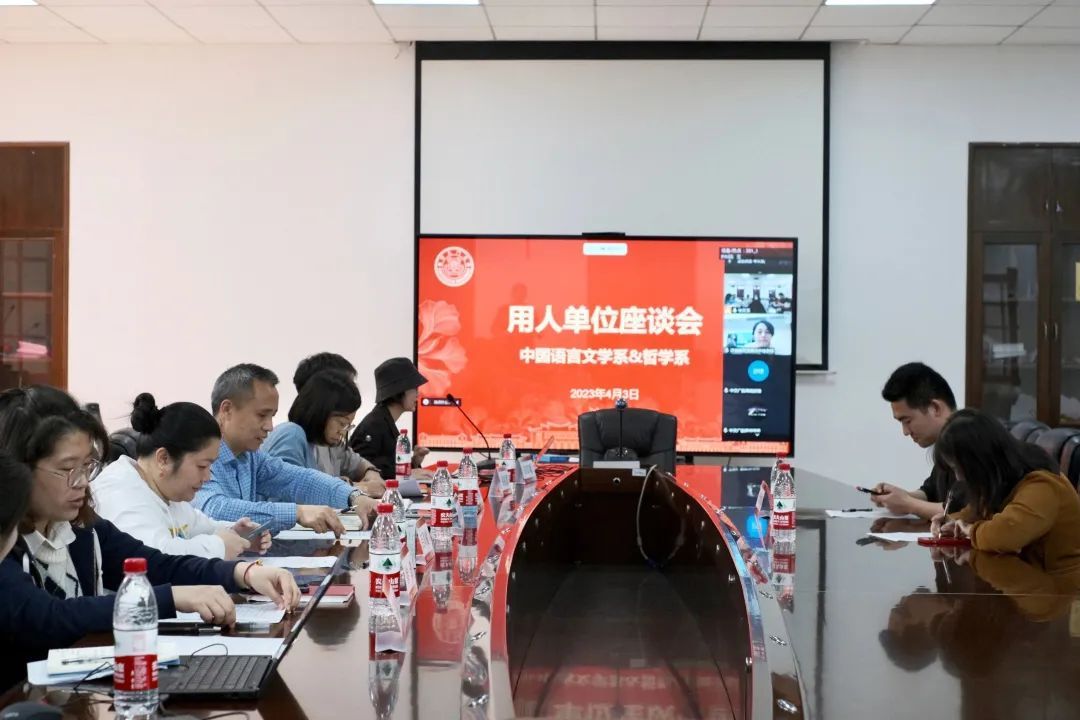 为促进人才培养质量和本科教育教学水平,积极推动人才培养与企业用人需求精准对接,增强与用人单位的密切联系,2022年4月3日上午,中国语言文学系、哲学系用人单位代表座谈会于南光一320会议室召开,本次座谈会采取线上与线下相结合的方式进行。中文系团委辅导员田苗瑞主持会议,中文系党委副书记葛学凤、哲学系党委副书记杨机像,中文系团委书记吕凤楠、教学秘书韩璟,哲学系团委书记蔡振磊、教学秘书蔡文倩,以及中交广航、中建五局、泉州市聚龙外国语学校、快乐学习、新东方、蓝天教育等用人单位负责人出席本次会议。