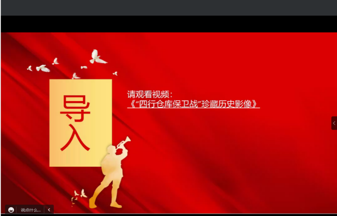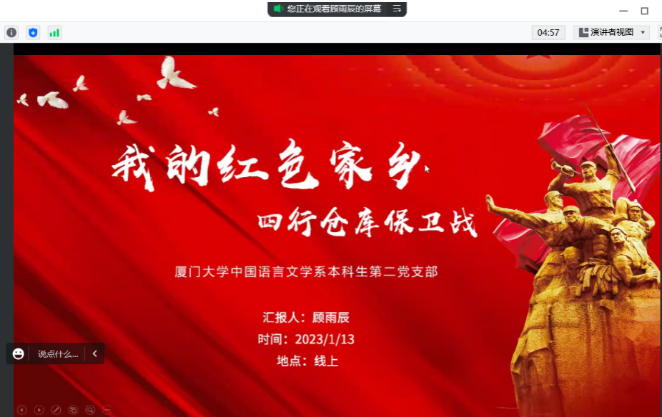 2023年1月13日,中国语言文学系本科生第二党支部携演武社区,于线上开展了“我的红色家乡”第六期活动,支部党员顾雨辰、赖叔青、张雨荷带领演武社区的孩子们一起学习了淞沪会战中四行仓库保卫战的历史,顾雨辰同志担任主讲人。