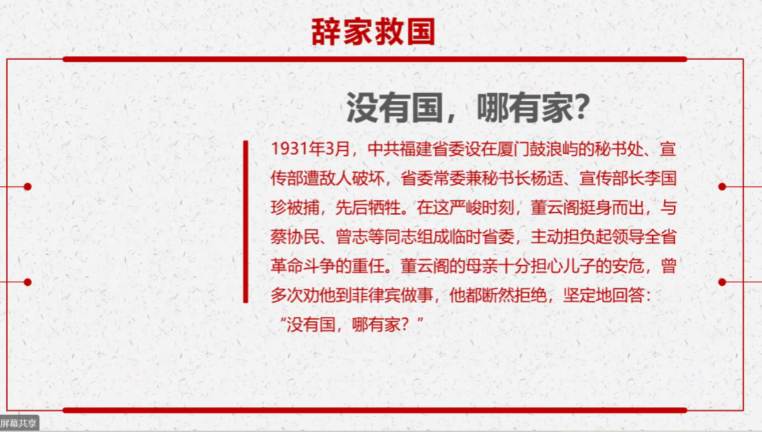 主讲人分青年时期、积极运动、辞家救国、光荣就义几个版块,向小朋友们讲述了董云阁同志的革命事迹:董云阁在学生时期就积极参加反帝爱国斗争,曾与共产党人罗扬才等人共同在厦门建立“闽南文化促进会”,在工人中宣传马克思列宁主义;加入党组织后,董云阁在家乡永宁开展革命活动,播撒革命火种;随着革命形势的不断发展,董云阁不顾个人安危,只身在厦门撑起革命领导工作,他断然拒绝母亲让他出国的恳求,做出了“没有国,哪有家”的回答;不幸被捕入狱后,董云阁始终不屈不挠,严守党的秘密,保持了共产党人的崇高气节,光荣就义。