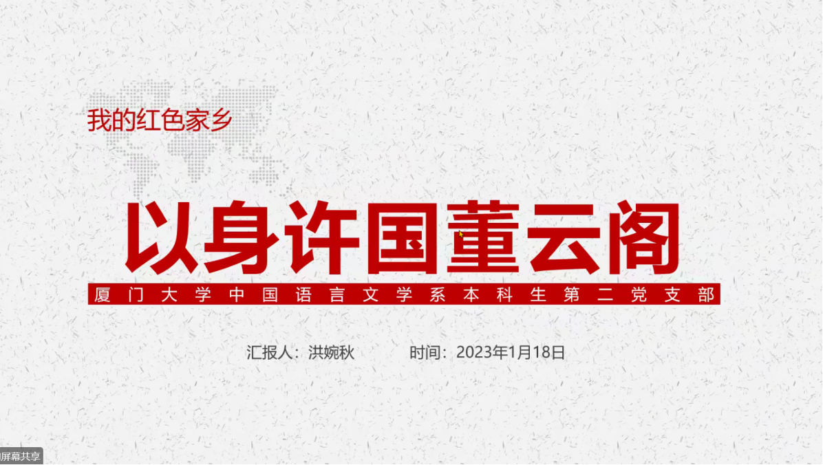 2023年1月18日,中国语言文学系本科生第二党支部携演武社区,于线上开展了“我的红色家乡”第七期活动,支部党员黄羽彤、洪婉秋、郑瀚如带领社区的小朋友们一起学习了革命先烈董云阁同志的故事。洪婉秋同志担任本次课堂的主讲人。