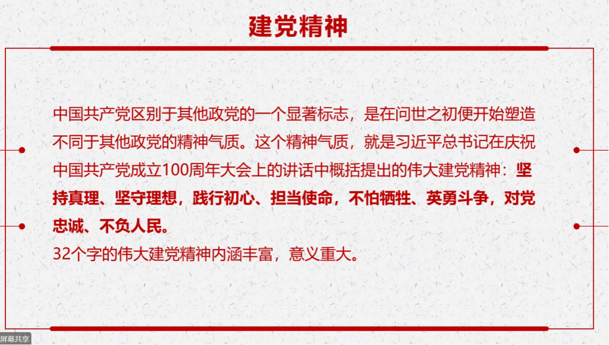习近平总书记在庆祝中国共产党成立100周年大会上的讲话谈到:“一百年来,中国共产党弘扬伟大建党精神,在长期奋斗中构建起中国共产党人的精神谱系,锤炼出鲜明的政治品格。历史川流不息,精神代代相传。我们要继续弘扬光荣传统、赓续红色血脉,永远把伟大建党精神继承下去、发扬光大!”作为新时代大学生党员,我们不仅要加强自身对于党史的学习,亦要讲好党的故事,在讲述中让党史学习教育深入人心,更好地传承革命精神,在行动中践行初心使命。