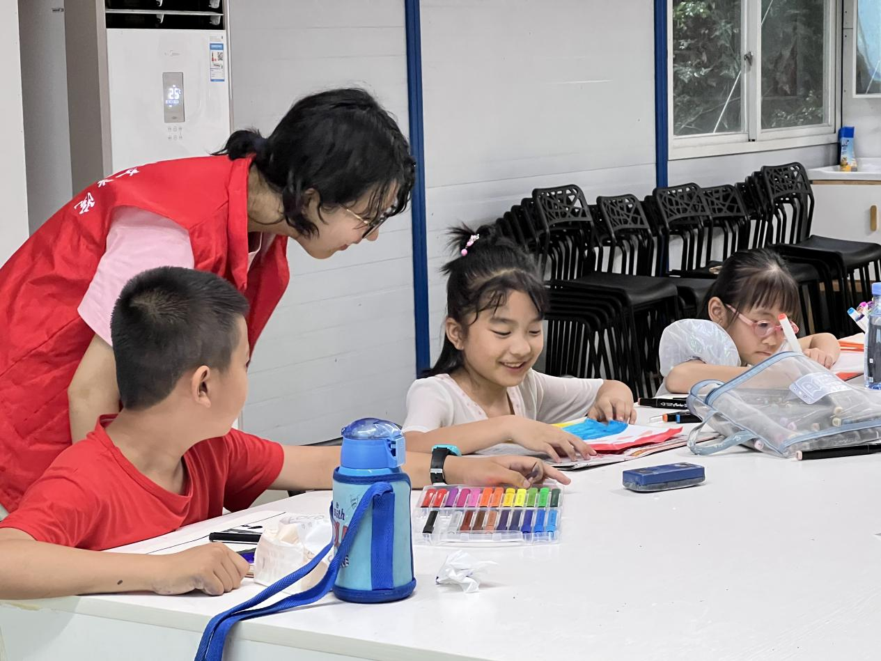 很高兴能参加本次活动!课上,我为小朋友们介绍了形线、明暗、色彩等绘画要素。窗外的大雨并没有冲散小朋友们的热情,反而成为了他们创作的灵感。有的小朋友特别积极,滔滔不绝地介绍自己对绘画的认知和自己的作品,我专心倾听并肯定,因为我觉得守护孩子的表达欲和创作欲很重要。课间,有几位小朋友向我展示了他们抓到的小昆虫,还有几位小朋友拿着纸杯在门口的屋檐下接雨。小朋友们带我重新感受到了童趣,他们也教会了我一些东西,这份体验很宝贵!