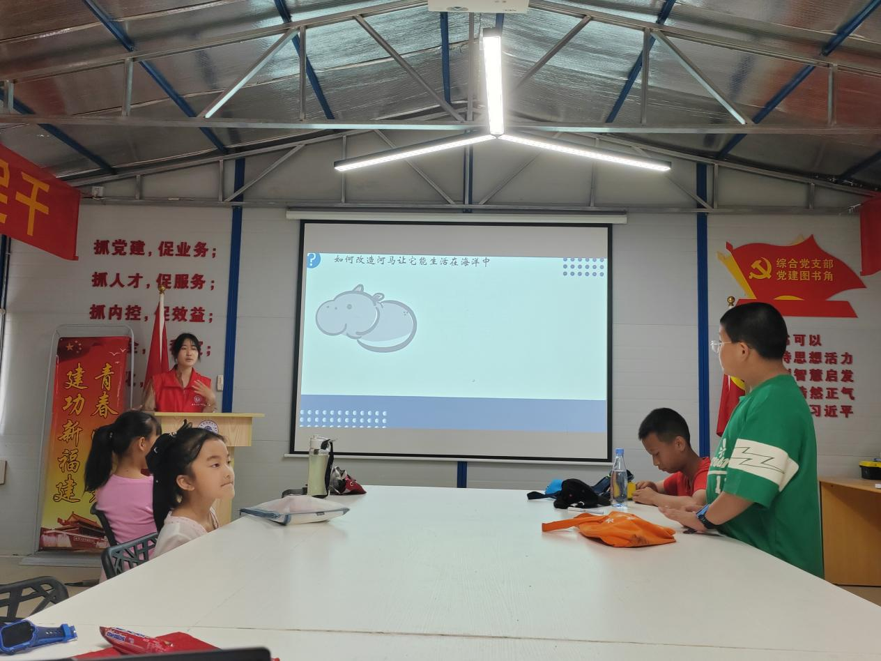 课堂开始,李盼引入主题“海洋生物设计师”,并说明学员的三个设计任务。这三个任务激发了学员们饱满的热情。第一个任务是设计水里的透明生物(南极冰鱼)。李盼结合视频向学员简要介绍了透明原理、血液的构成与功能等基础理论知识,然后引入话题:海洋中透明的鱼,小学员们听得津津有味。第二个任务是设计能够固定在海水中的鱼卵。学员们积极讨论想办法,李盼以鲨鱼卵为例,结合视频“鲨鱼的种类”徐徐道来。话题十分有趣,下课后,小学员们还积极地与志愿者讨论相关问题细节。第三个任务是设计如何让河马生活在海洋中,李盼从河马是否会游泳引入,介绍河马与鱼的不同。她结合“河马向鲸鱼演变”的视频,给出将河马改造成鲸鱼的思路。最后,志愿者给学员播放“用行动保护海洋”的视频,希望小学员们能够树立保护环境、保护海洋生物的意识。