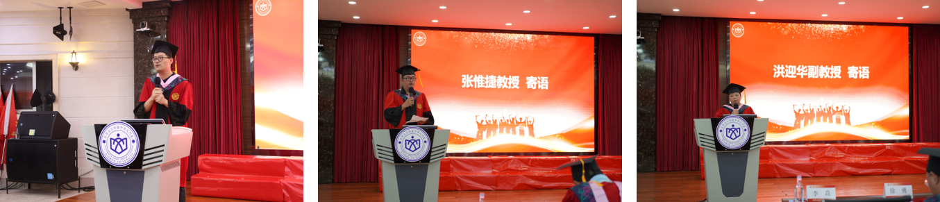 本科生班主任代表乐耀教授,研究生导师代表张惟捷教授、洪迎华副教授作为教师代表依次为毕业生寄语。乐耀回顾自己毕业后在厦大与本科生的情谊,嘱托同学们不忘保持一份通透心态和高尚品格;张惟捷鼓励同学们要善于在危机中窥见转机,迎来属于自己的灿烂光明;洪迎华希望中文系学子们既要将所学服务于社会、贡献于社会,又能用所学滋养自己、温暖自己!毕业生代表上台为三位老师分别献上一束芬芳的鲜花。