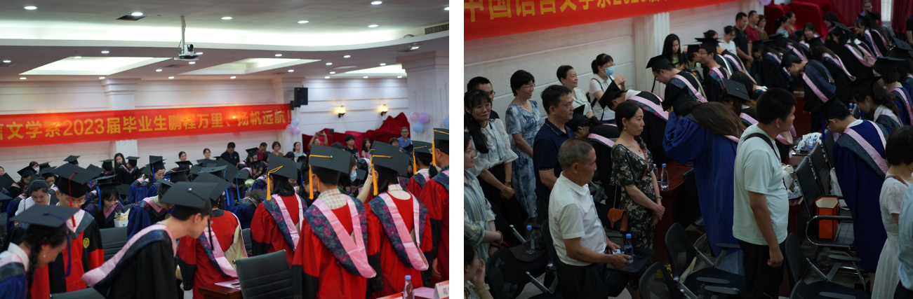 伴随《感恩的心》的动人旋律,中文系2023届全体毕业生起立,二行鞠躬大礼,一谢师恩,再谢亲恩。深深弯腰的那一刻,感动蔓延全场。