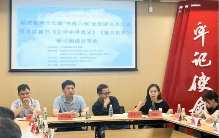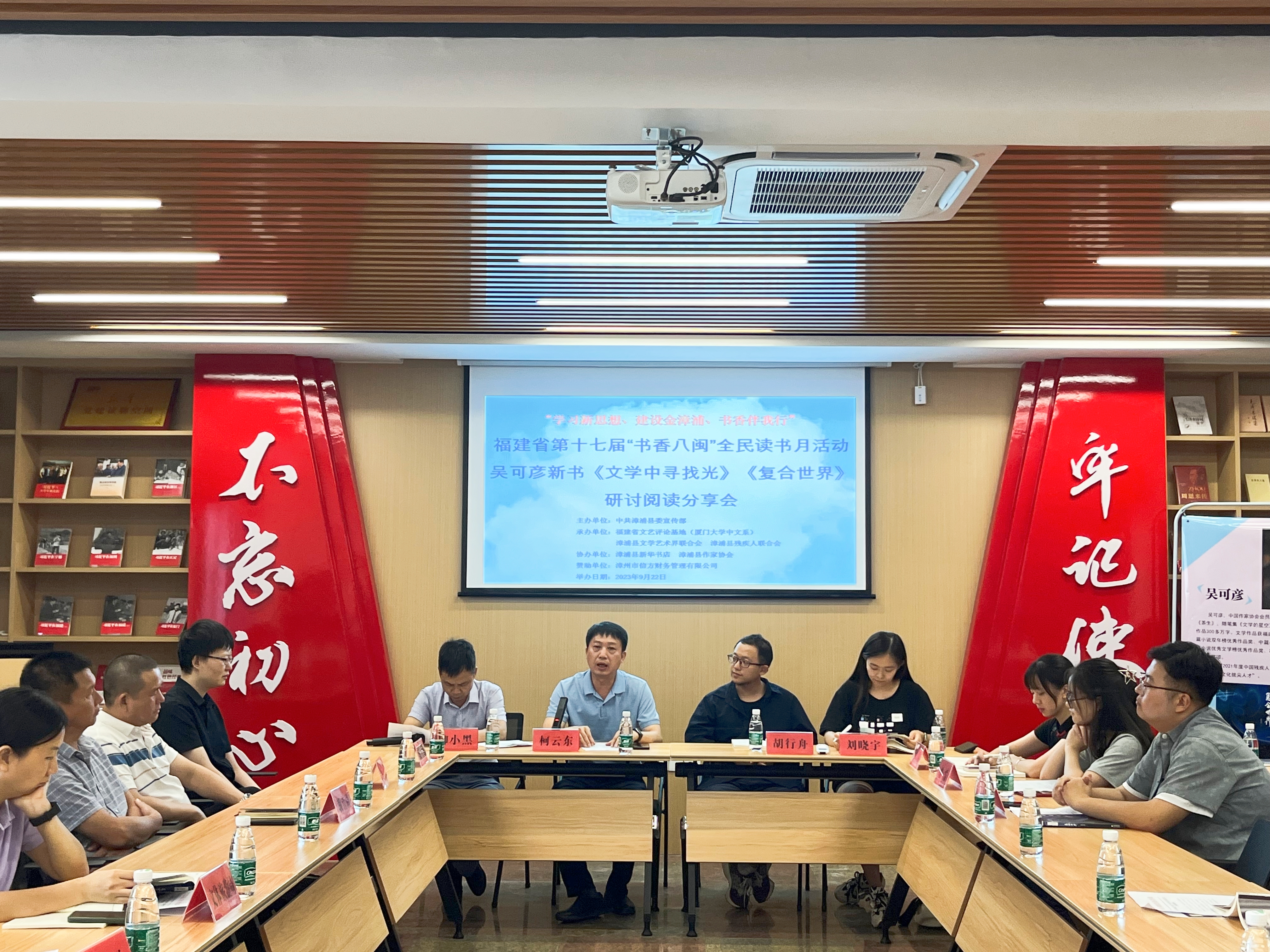 9月22日,由中共漳浦县委宣传部主办,福建文艺评论基地(厦门大学中文系)、漳浦县文联、漳浦县残联承办,漳浦县新华书店、漳浦县作协协办的福建省第十七届“书香八闽”全民读书月活动暨吴可彦新书《文学中寻找光》《复合世界》研讨阅读分享会在漳州市漳浦县新华书店召开。漳浦县文联主席柯云东到会致辞,中共漳浦县委党校副校长柳小黑主持,漳浦县新华书店总经理曾宪强莅临。漳浦县县直有关单位分管领导、各乡镇场党委宣传委员到场。我系助理教授刘晓宇、胡行舟,博士研究生廖雪霞,本科拔尖基地班代表杨云超、盛雪作为师生代表参与活动并分别作主题发言。