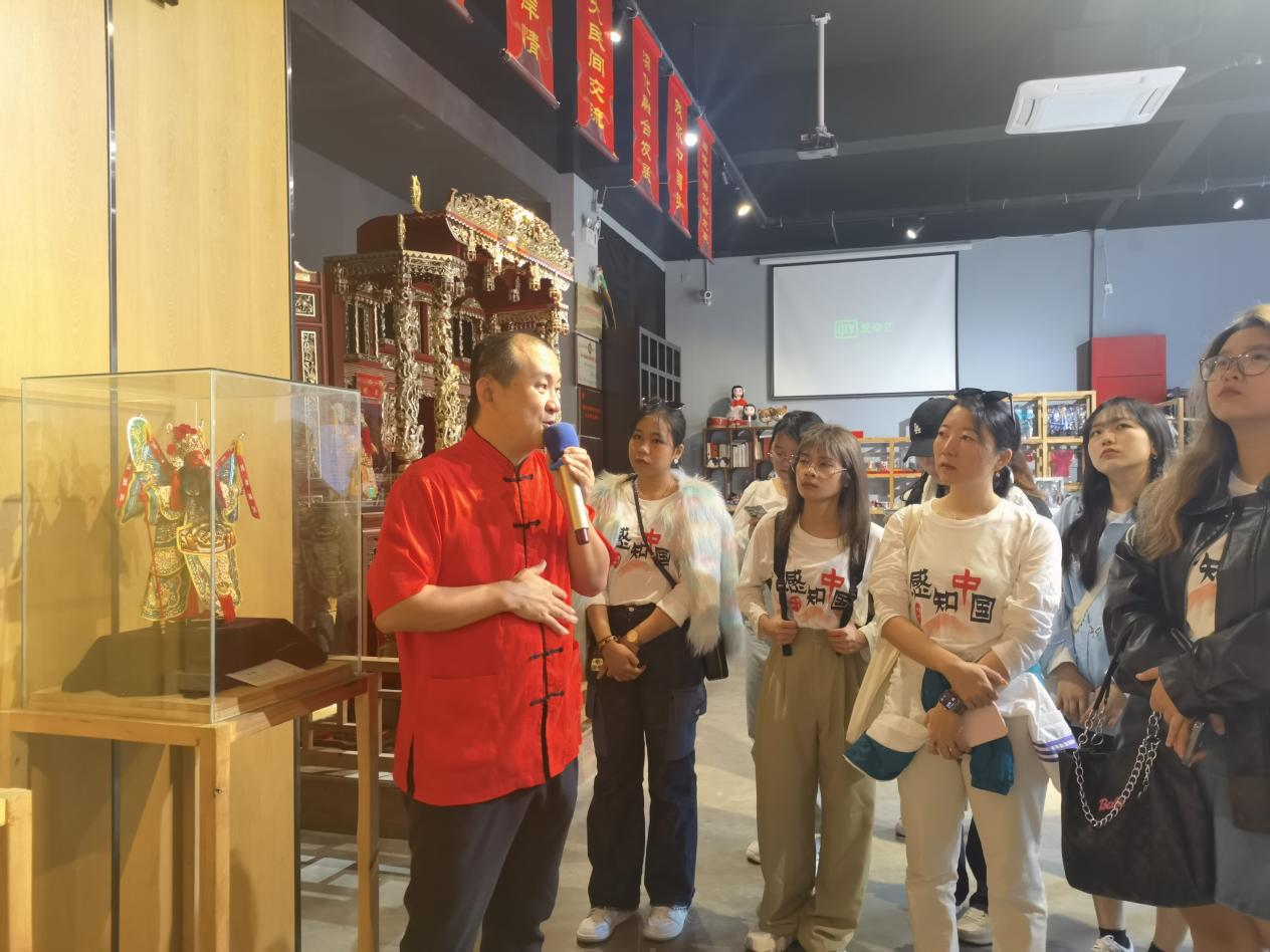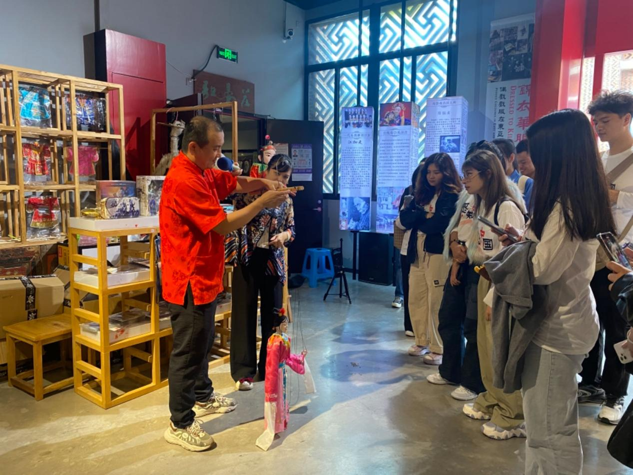 上午9:00,师生一行一同乘车来到厦门市思明区曾厝垵弘晏庄木偶皮影戏传习中心,深入了解传承千年的布袋戏技艺。在福建布袋木偶戏省级代表性传承人、弘晏庄木偶艺术馆创办人庄晏红的介绍下,同学们初步了解了几类木偶的特征。