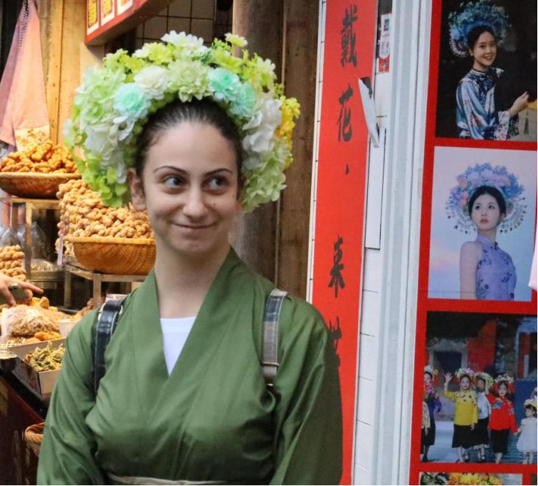在当地居民的帮助下,中外学生穿上了满满“中国风”的服装,头顶簪戴上了鲜艳明丽的花朵。头上簪花围,象征着勇敢、奔赴、热爱,通过簪花体验,这样的美好寓意也传达给了来自五湖四海的每一位留学生。