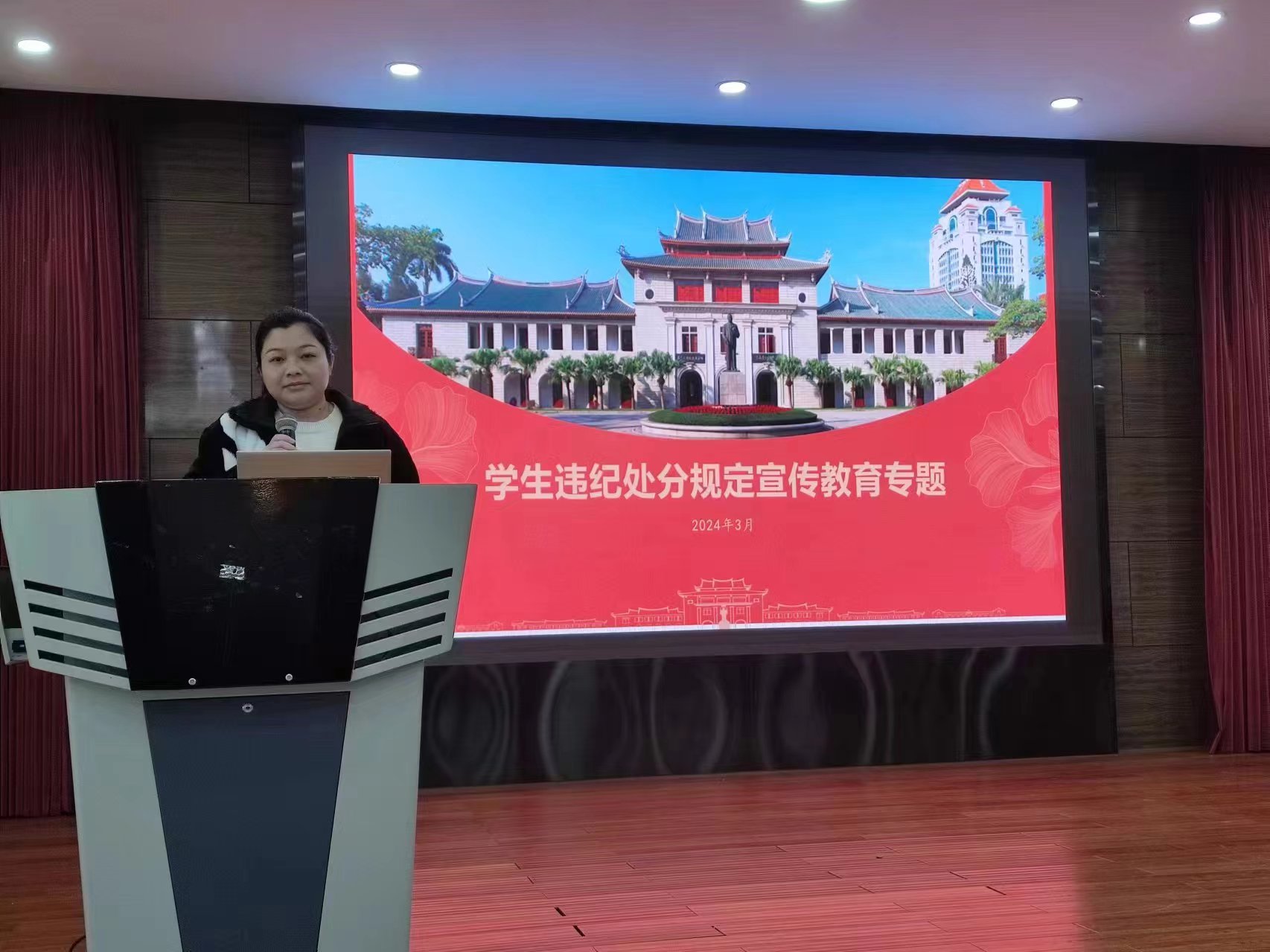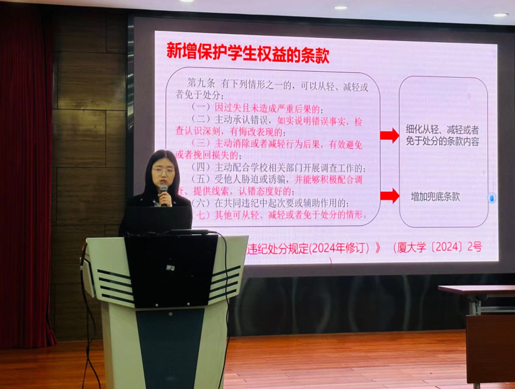 会上,团委老师们介绍并解读了厦门大学新版《厦门大学学生违纪处分规定(2024年修订)》及《厦门大学思明校区电动自行车管理暂行办法》,并针对防范诈骗、电动自行车管理、网络行为规范、安全教育、大学生职业生涯规划等相关工作进行强调。