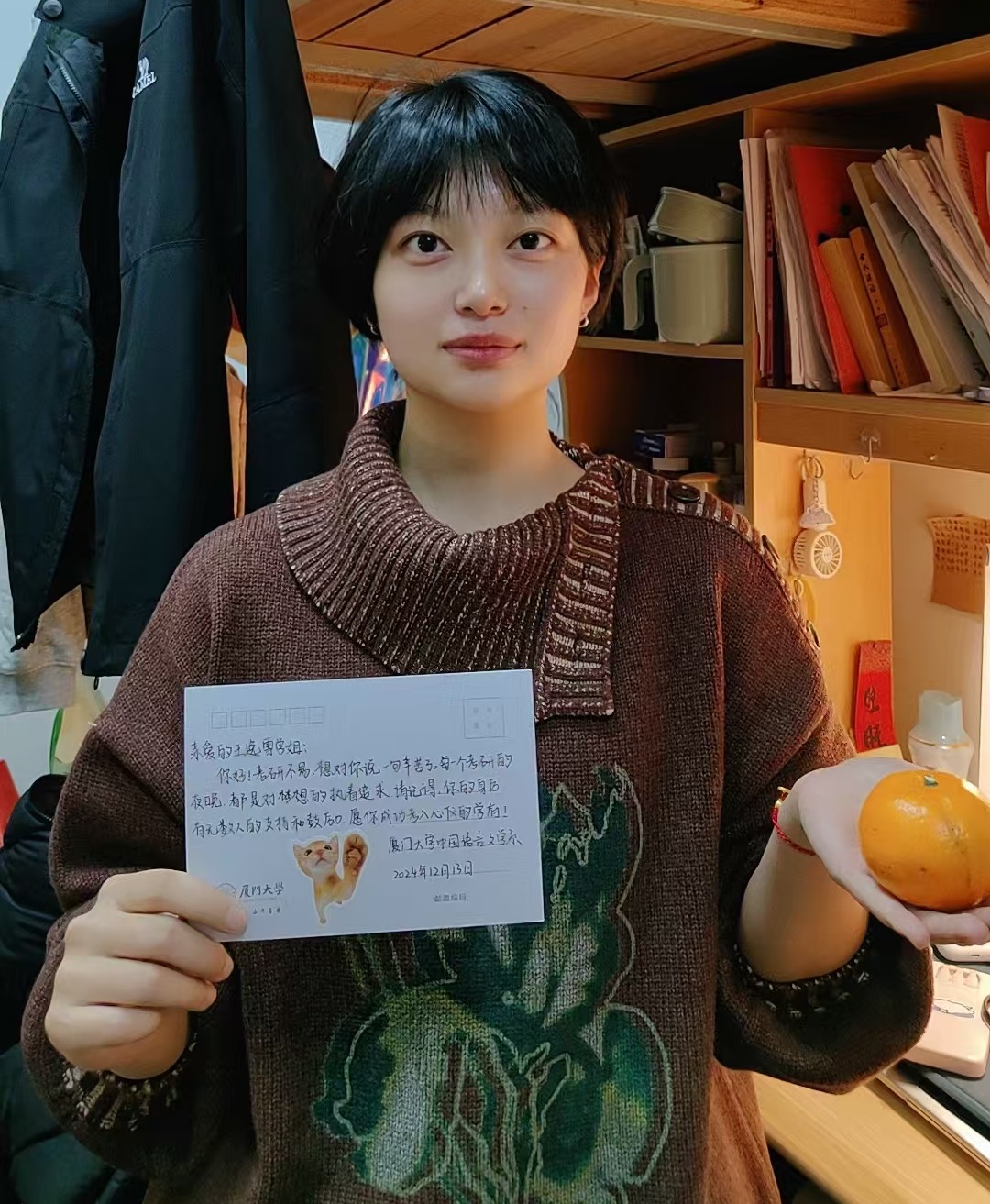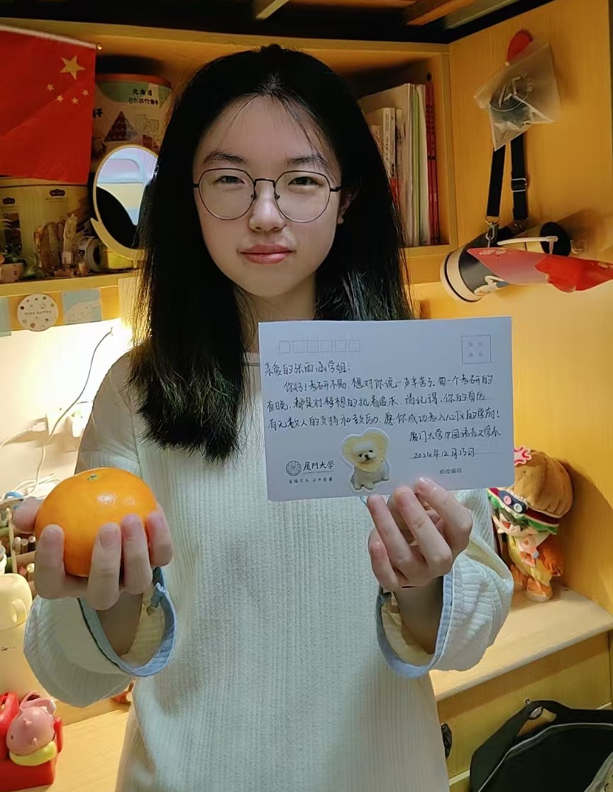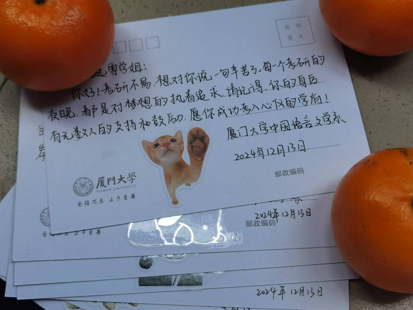 为缓解中文系备考学子的压力、增强他们的考试信心,2024年12 月 13 日晚,中文系准备了手写祝福贺卡和橘子等备考暖心礼物,为考研学子送去温暖与鼓励。