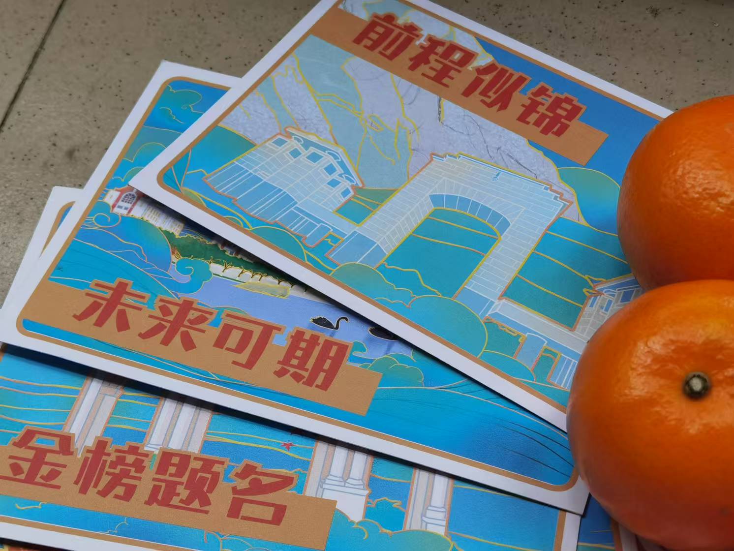 一个个黄澄澄、圆滚滚的橘子,仿佛一个个小太阳,散发着温暖的光芒;一张张精美绝伦的明信片,如同一只只传递祝福的信鸽,承载着满满的爱与期待。橘子寓意着“吉祥如意”、“大吉大利”,那饱满的果实仿佛在向考研学子们诉说:加油,你们一定能行!