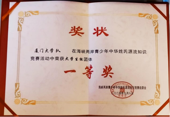 经过一番紧张激烈的比拼,厦门大学队以第一名的成绩,斩获大学生组团一等奖;同时,在“姓氏小故事”评选中,陈扬获个人一等奖、谷天洋获个人三等奖,冯源获得个人优秀奖;厦门大学获优秀组织奖。值得一提的是,本次比赛不仅实现了团体与个人的新突破,还取得了自2018年以来的最好成绩。