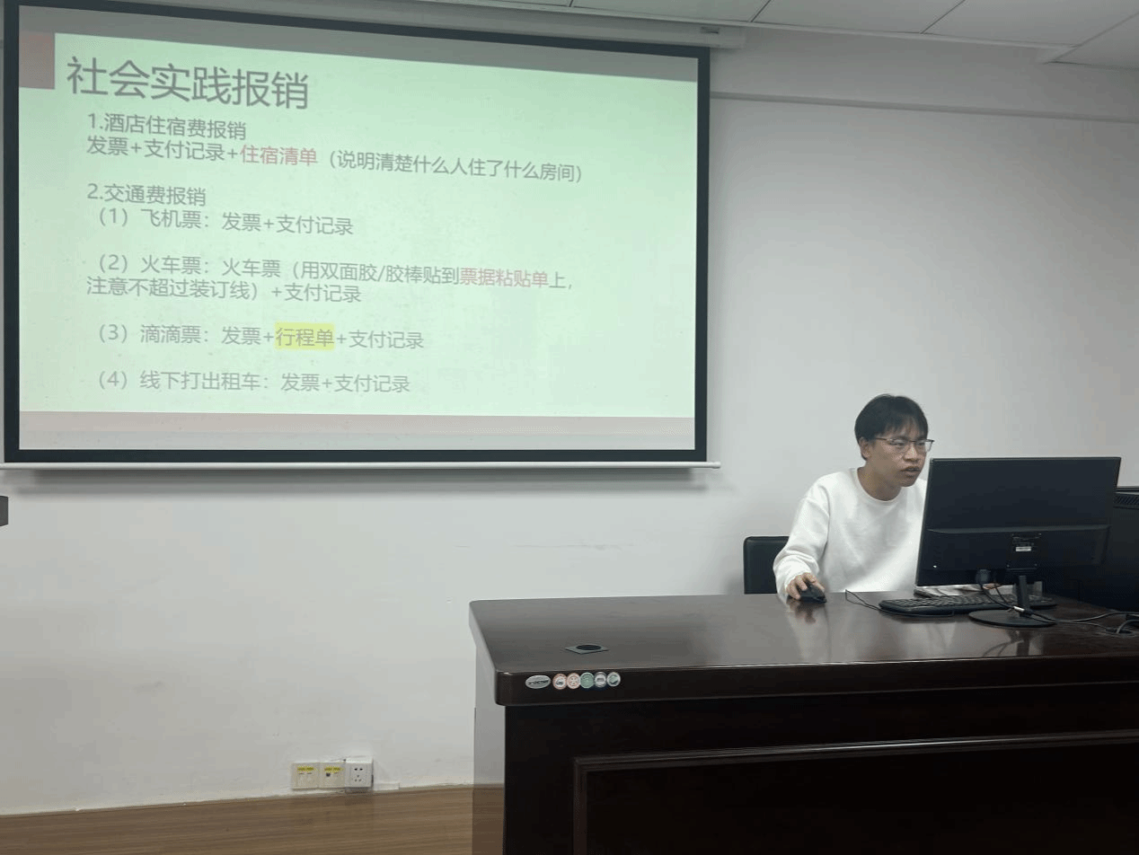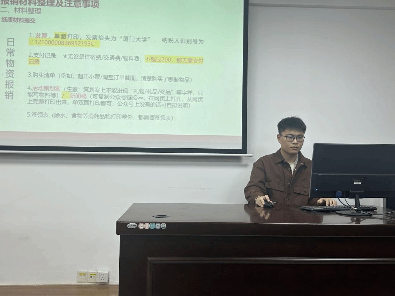 中文系学生会组织部负责人郭玮豪、张俊豪围绕财务报销工作展开培训。郭玮豪系统梳理了财务报销工作所需要经过的各个环节,并着重强调了策划案撰写及预算表设计需要注意的各类问题。张俊豪则详细介绍了财务报销工作所需要的各类纸质材料和电子材料,他着重强调材料准备的规范性问题,并详细介绍了具体工作中可能遇到的特殊情况及其应对方法。在答疑环节,参会骨干们纷纷就自己曾在报销工作中遇到的难题进行提问,两位负责人认真细致地进行了解答。