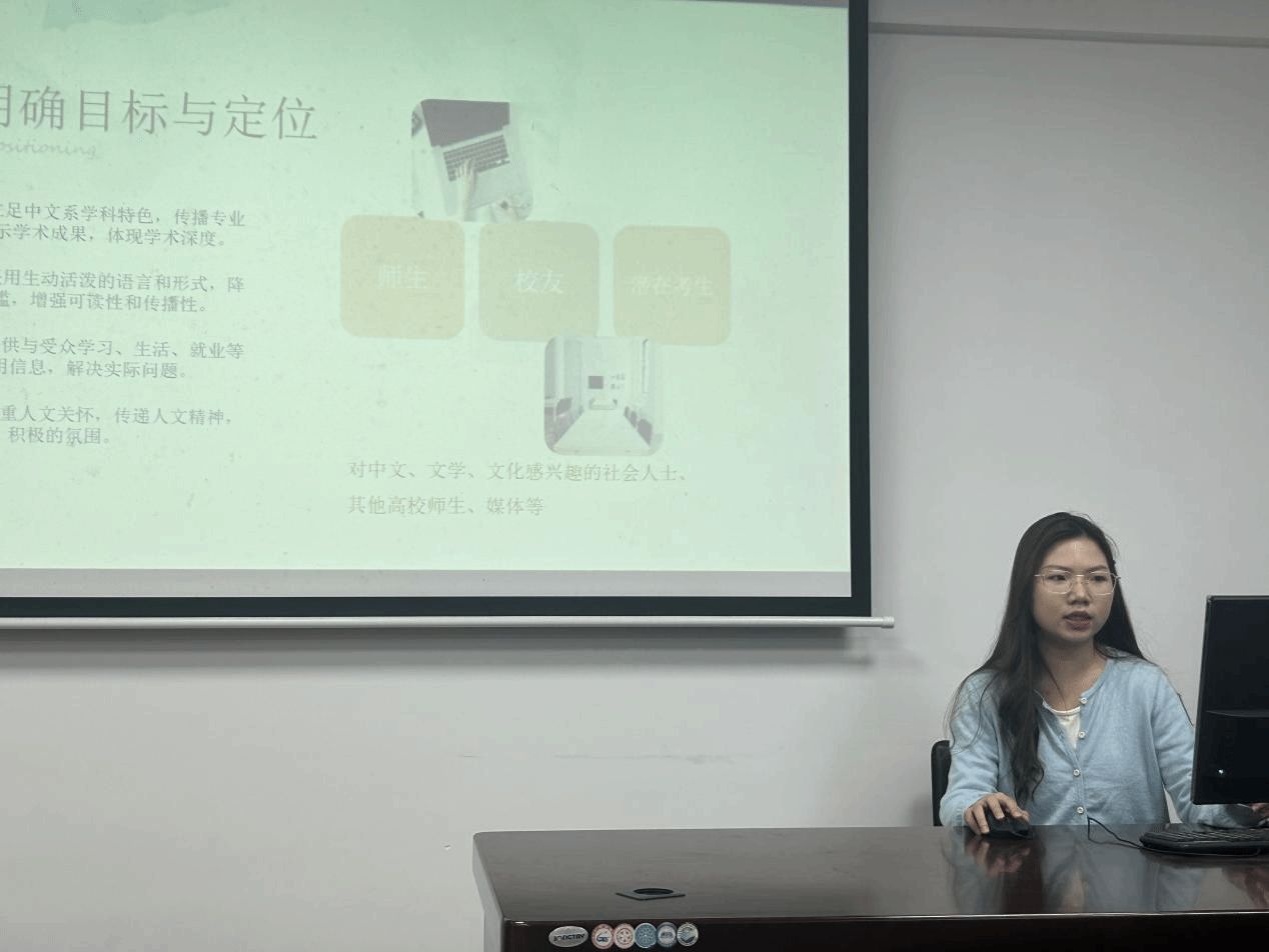 中文系研究生会宣传部负责人余飞樊围绕推文策划展开培训。余飞樊结合实例,从“核心流程”“常见问题”“实战互动”三个维度展开讲解。她强调:“推文不仅是信息的传递,更要通过故事化表达引发共鸣。”目标定位和时间节点的明确是推文策划的重要环节,必须立足于中文系学科特色,向媒体、其他高校师生、以及对中文感兴趣的社会人士展现中文系的学术深度和人文关怀。在“避坑指南”一节中,余飞樊详细介绍了文稿、摄影与排版的操作细节和注意事项,同时通过对比分析多篇高传播度推文,让参会骨干们直观感受到标题设计、图文搭配与传播效果间的紧密关联。培训特别设置“互动提问”环节,余飞樊与参会骨干就各部门在日常推文策划工作中遇到的问题进行了热烈而充分的交流。