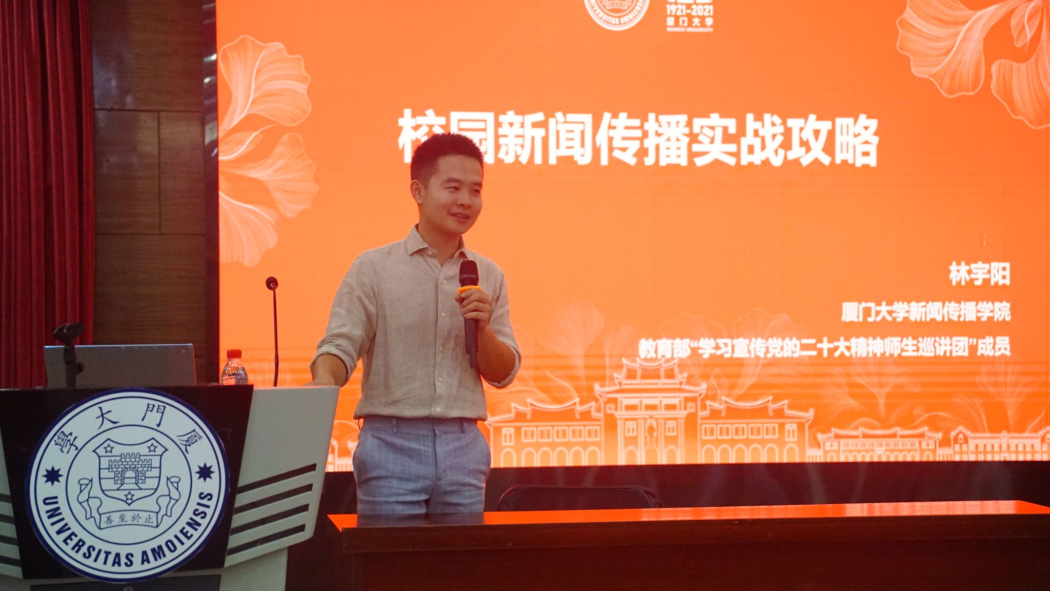培训会上,林宇阳首先从宏观层面阐述了宣传工作的重要性。围绕主流舆论传播,他重点分享了故事传播、借势传播与节庆传播三大策略,并强调“故事传播”是引发情感共鸣、提升传播效果的最佳方式,而“节庆传播”则能巧妙平衡宣传的频次与深度。在实操环节,林宇阳还就新闻摄影的基础知识进行了讲解,从构图技巧、人物拍摄角度,到如何突出关键信息、贴合会议主题,内容详实,令在场师生受益匪浅。