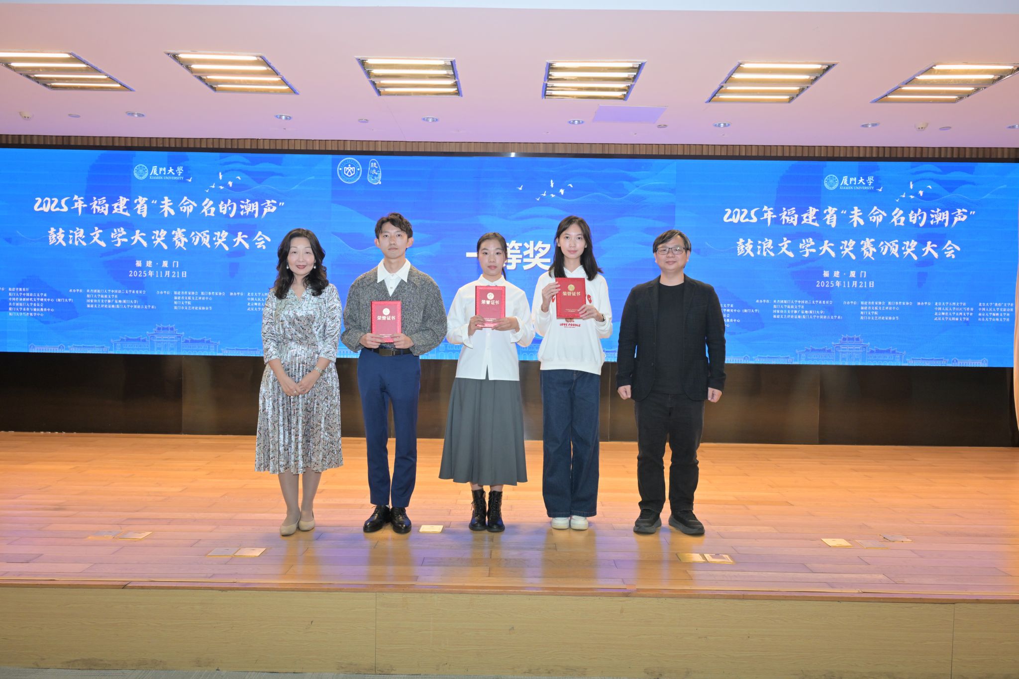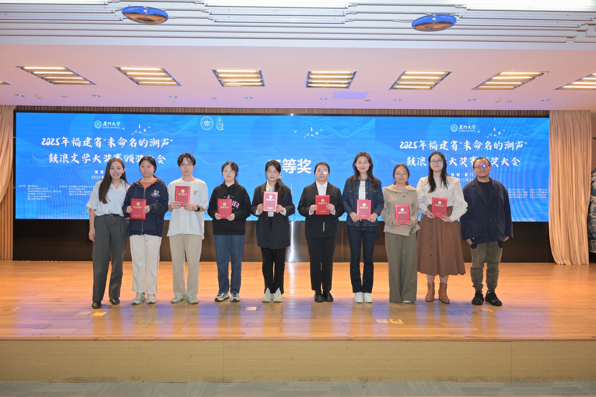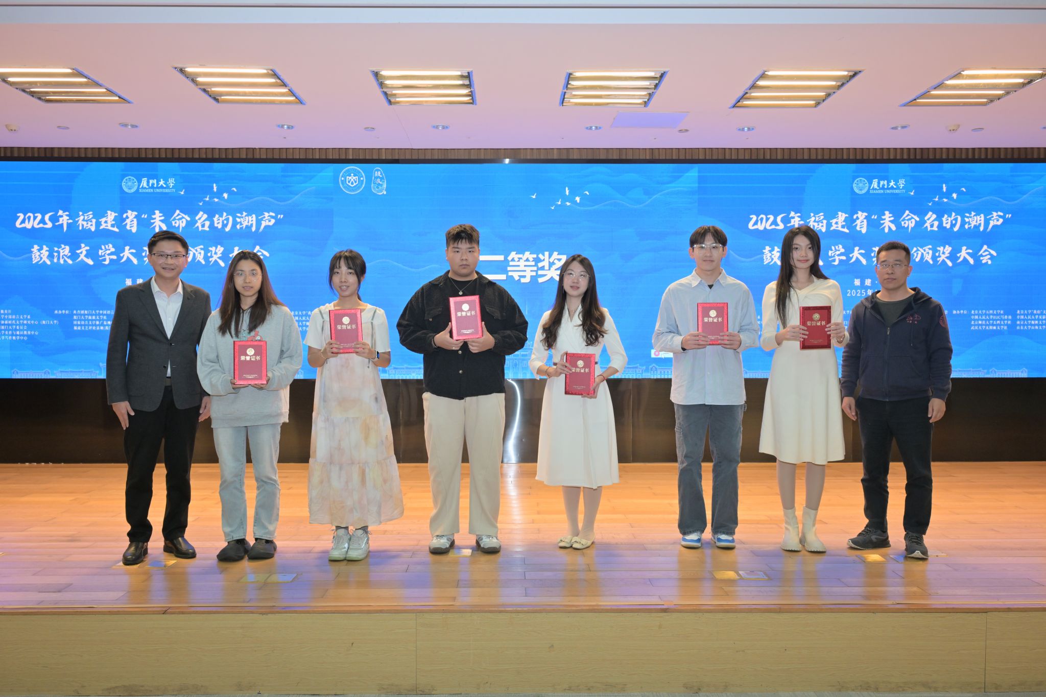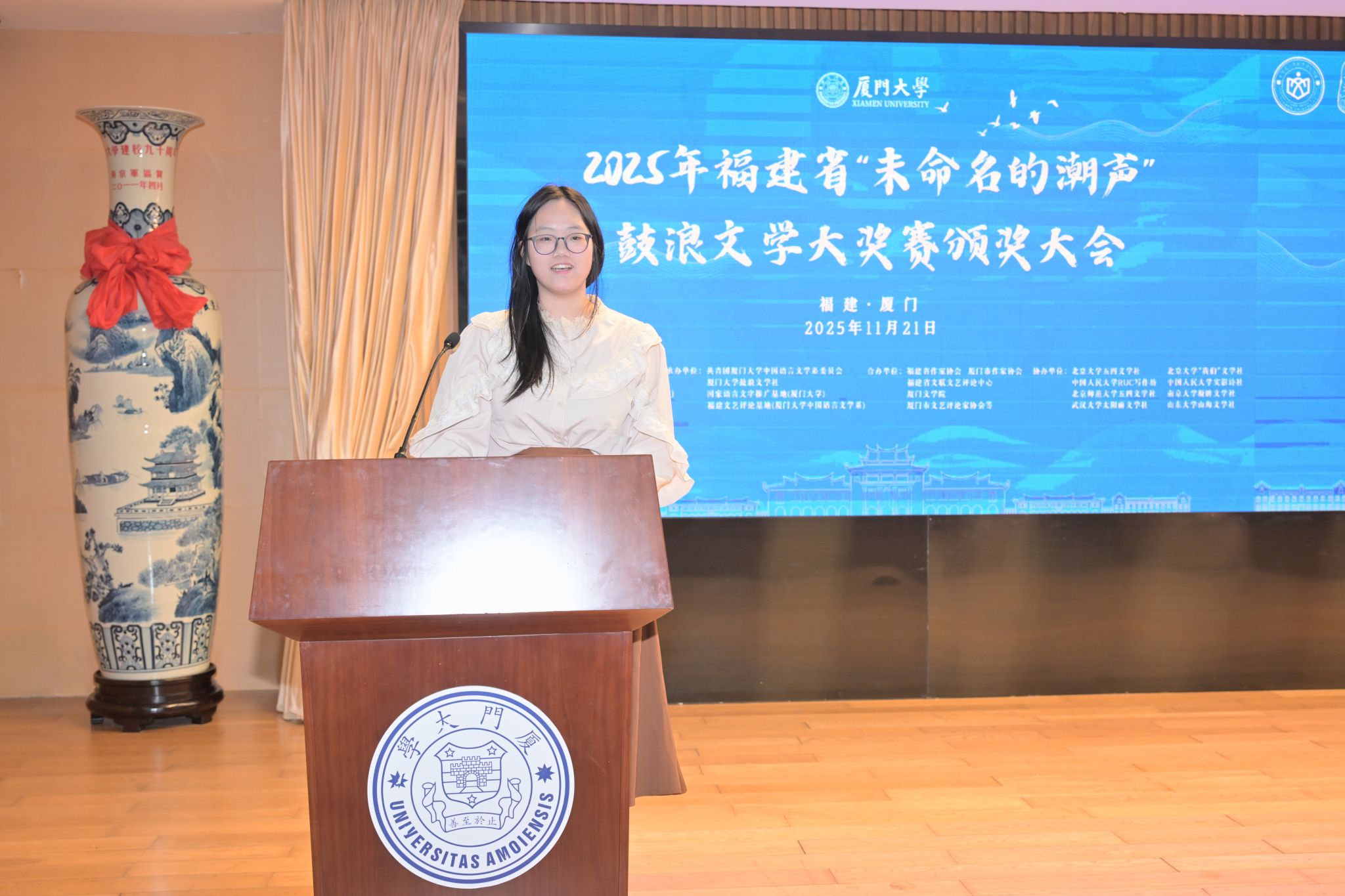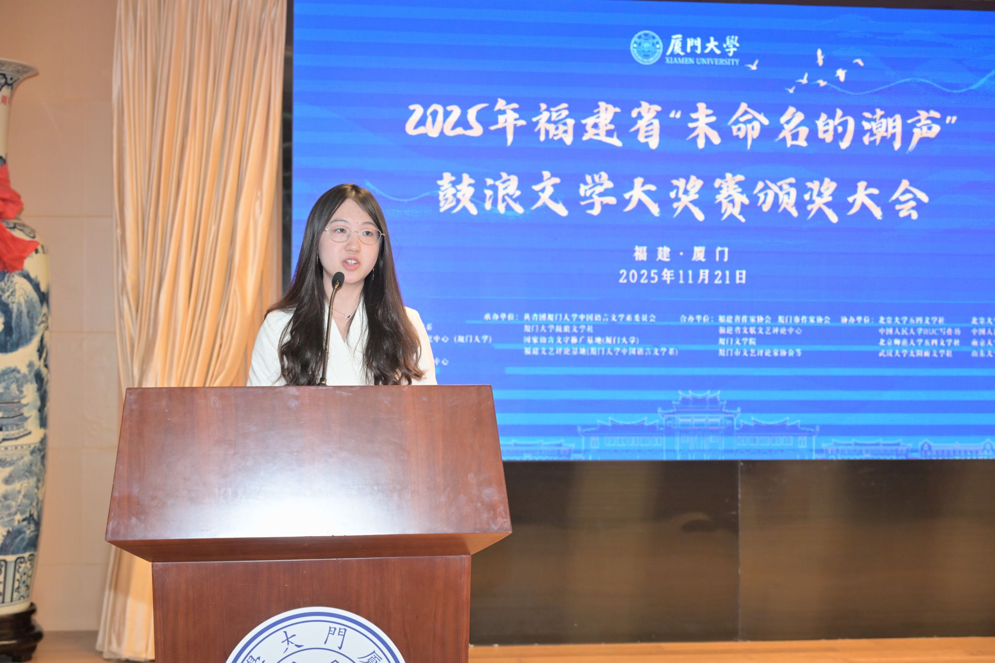 11月21日下午, 2025年福建省“未命名的潮声”鼓浪文学大奖赛颁奖仪式,在厦门大学思明校区科学艺术中心多功能厅顺利举行。福建省作家协会副主席、儿童文学作家李秋沅,特邀嘉宾、广州市作家协会副主席陈崇正,共青团厦门大学委员会副书记郭江淮,中国语言文学系党委副书记蔡虎堂,美育与通识教育中心秘书李仕耘,鼓浪文学社指导老师、中国语言文学系助理教授胡行舟,中国语言文学系助理教授刘晓宇,以及获奖选手代表、鼓浪文学社社员和厦门大学文学爱好者共同出席。仪式由中国语言文学系2023级本科生冯源主持。