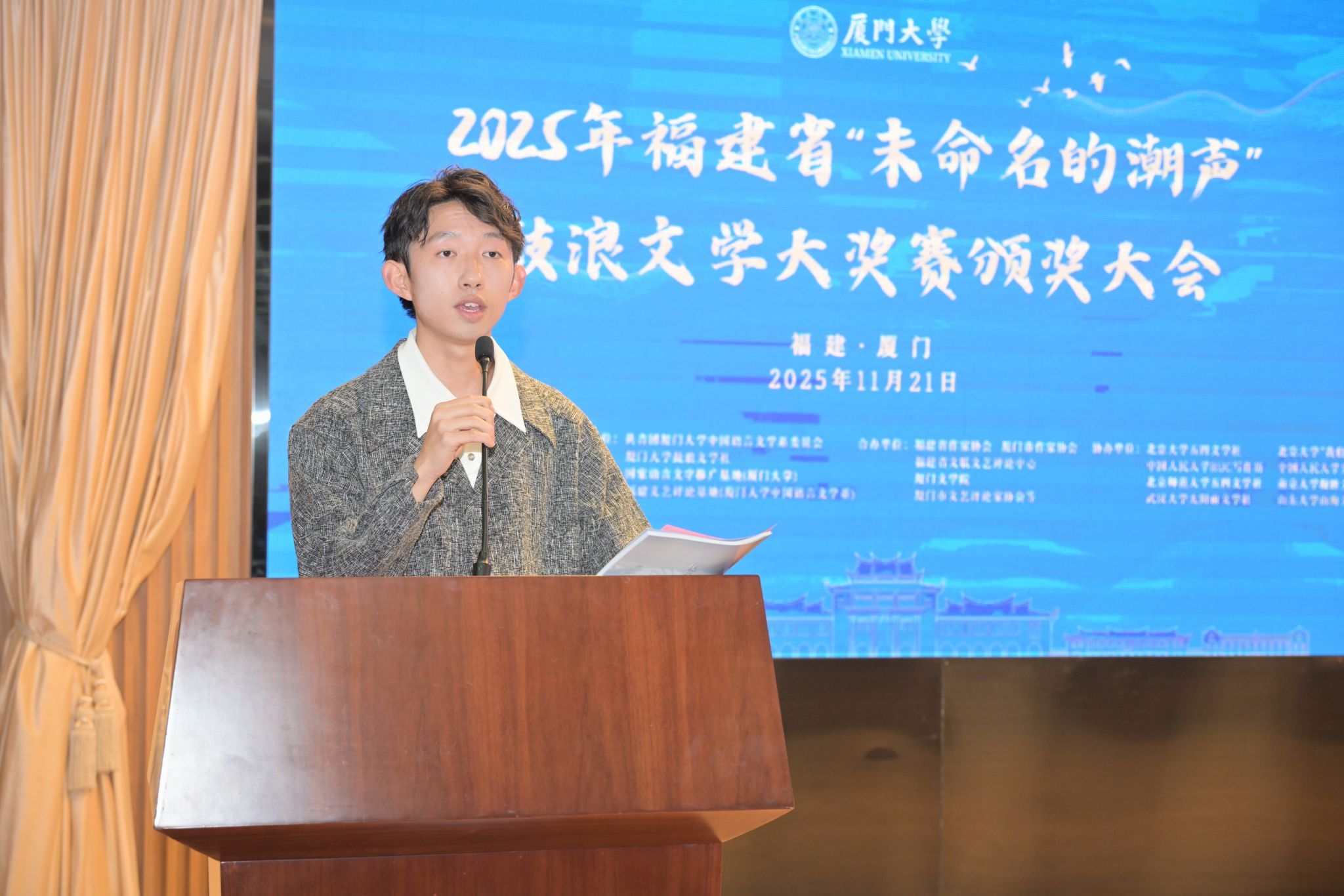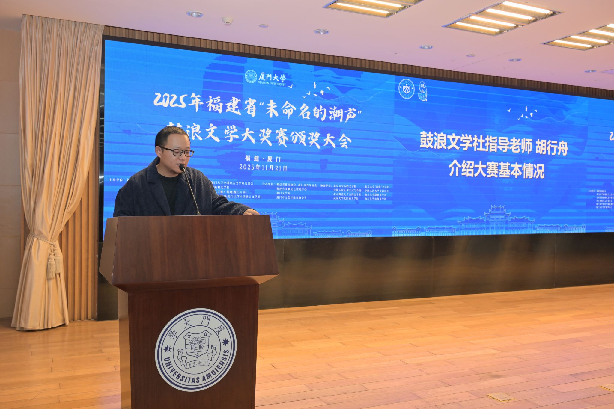 鼓浪文学社指导老师、中国语言文学系助理教授胡行舟介绍了本届大赛的基本情况。2025年“未命名的潮声”鼓浪文学大奖赛由福建省教育厅、厦门大学中国语言文学系、中国作协新时代文学研究中心(厦门大学)、共青团厦门大学委员会、厦门大学美育与通识教育中心、厦门大学写作教学中心联合主办;由共青团厦门大学中国语言文学系委员会、厦门大学鼓浪文学社、国家语言文字推广基地(厦门大学)、福建文艺评论基地(厦门大学中国语言文学系)承办;并与福建省作家协会、厦门市作家协会、福建省文联文艺评论中心、厦门文学院厦门市文艺评论家协会合办;同时联合北京大学、中国人民大学、北京师范大学、南京大学、武汉大学、山东大学等多家兄弟高校的文学社团协办。