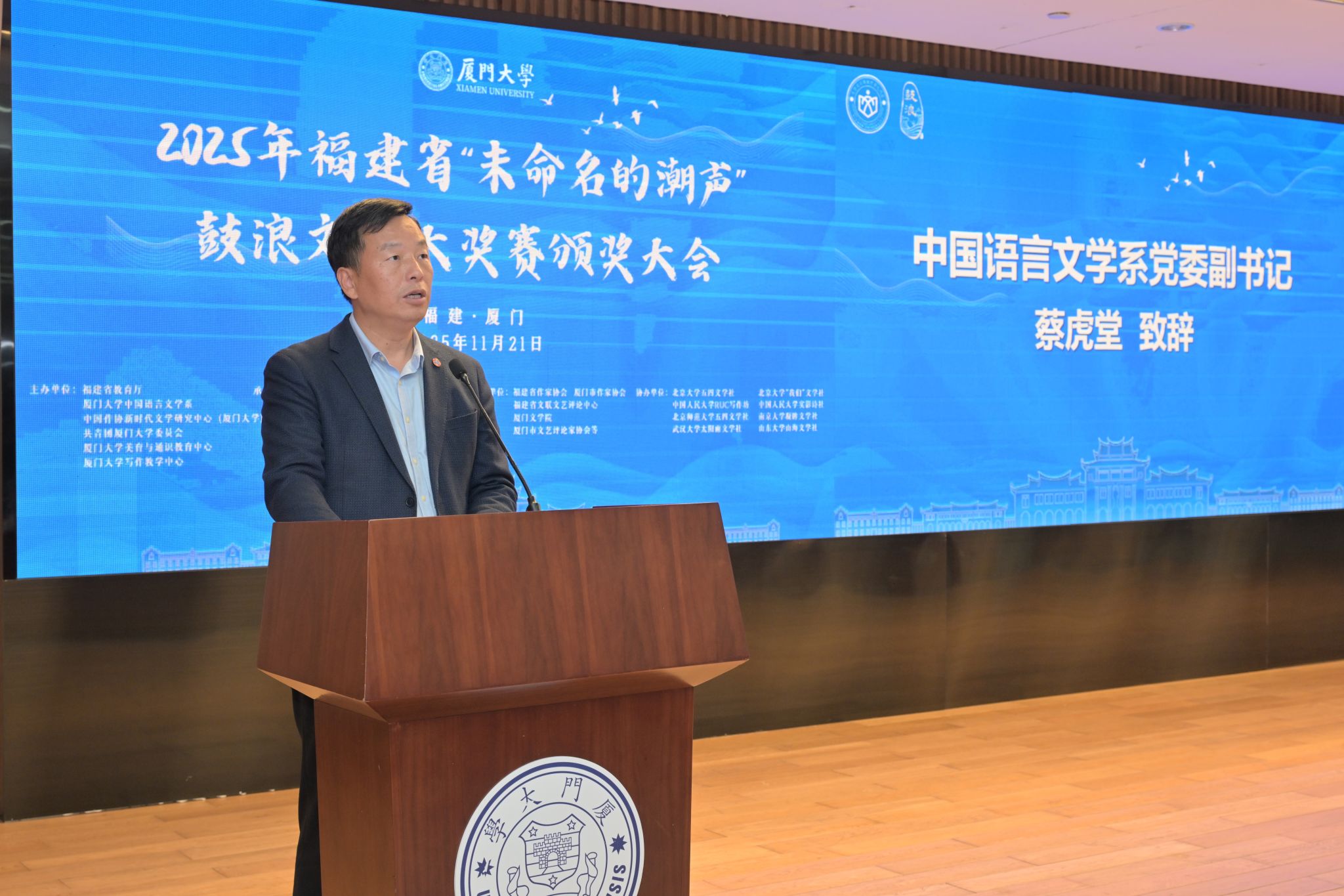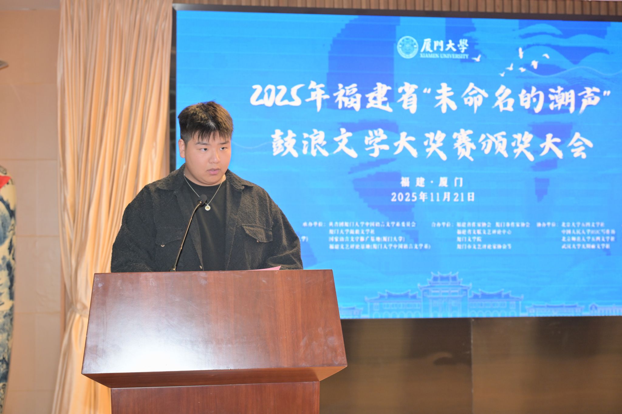 中国语言文学系党委副书记蔡虎堂为颁奖仪式致辞。他首先代表中文系向获奖同学表示热烈祝贺,并向所有支持本次大赛的师生同仁致以诚挚感谢。蔡虎堂回顾了由鲁迅先生亲手创办的鼓浪文学社与厦大中文系之间深厚的文学渊源。他指出,鼓浪文学大奖赛正是这一文脉在当代的生动延续,已成为激励青年书写时代、涵养心灵的重要平台。他强调,在坚定文化自信、推进文化强国建设的时代背景下,青年创作者应自觉肩负使命,将个人艺术追求融入时代洪流,用有温度、有格局的精品力作讲好中国故事,为社会主义文化繁荣发展贡献青春力量。