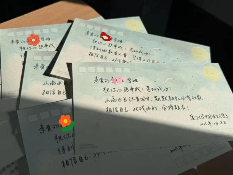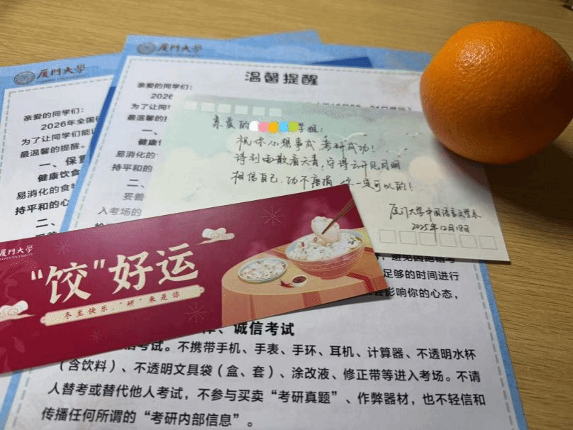 为鼓舞考研学子士气,缓解备考压力,12月18日晚,中国语言文学系为正在紧张备考的学子们送上了一份精心准备的温暖礼包,包含手写祝福贺卡、寓意吉祥的橙子及“暖心饺子券”,以此表达全系师生对考研同学的深切关怀与支持。