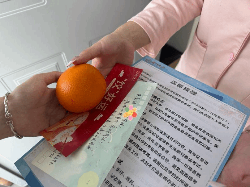 每一张贺卡上都书写着真挚的祝愿:“祝你心想事成!考研必胜!”“相信自己,此战必胜”……一笔一划,承载着师长同窗的鼓励与期盼。金黄的橙子,寓意“成功”与“称心如意”,愿这一抹鲜亮和酸甜,能舒缓备考的疲惫,为学子注入活力。此外,系里还特别准备了“暖心饺子券”,一份热气腾腾的饺子,不仅暖胃暖心,更寄托着“饺好运”的美好寓意,陪伴学子温暖奔赴考场。