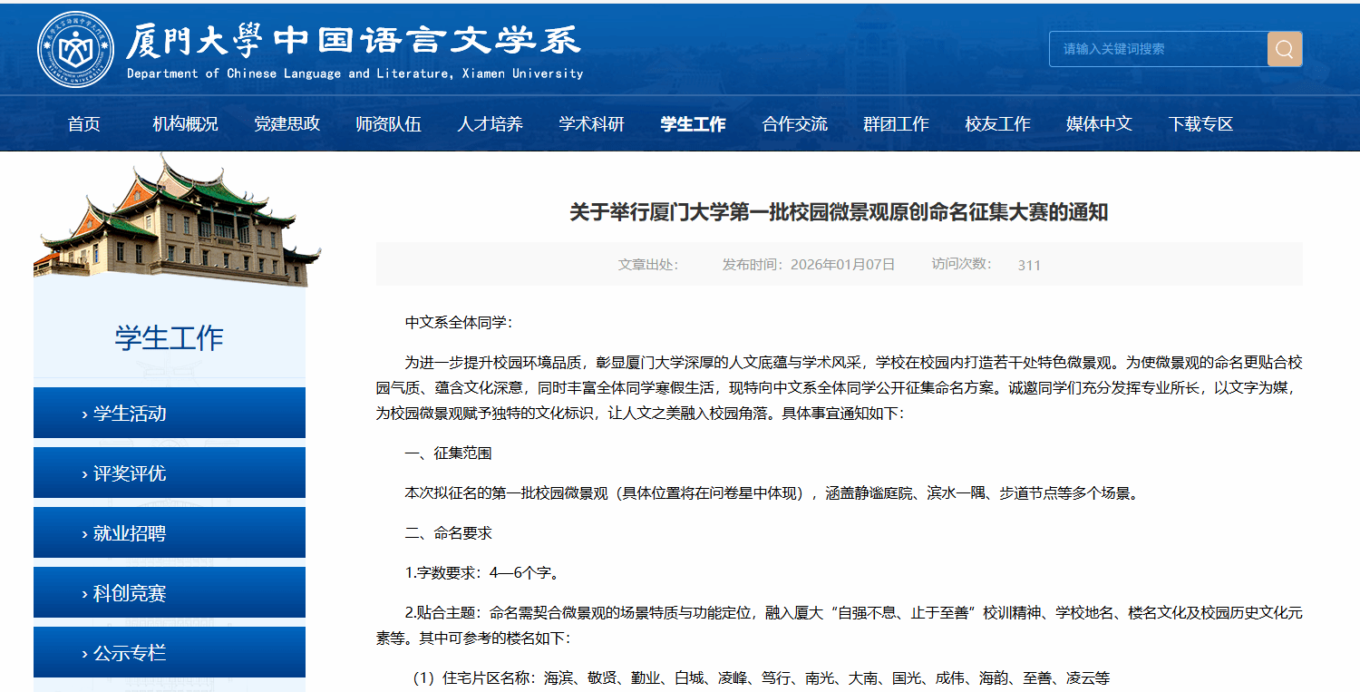 1月7日,中文系发起校园微景观原创命名征集大赛,鼓励同学们以文字为媒介,为校园景观注入人文内涵。同学们积极响应,以精炼雅致的语言赋予每处角落独特意蕴,让文气浸润校园,也为寒假生活添上一份笔尖上的雅趣。